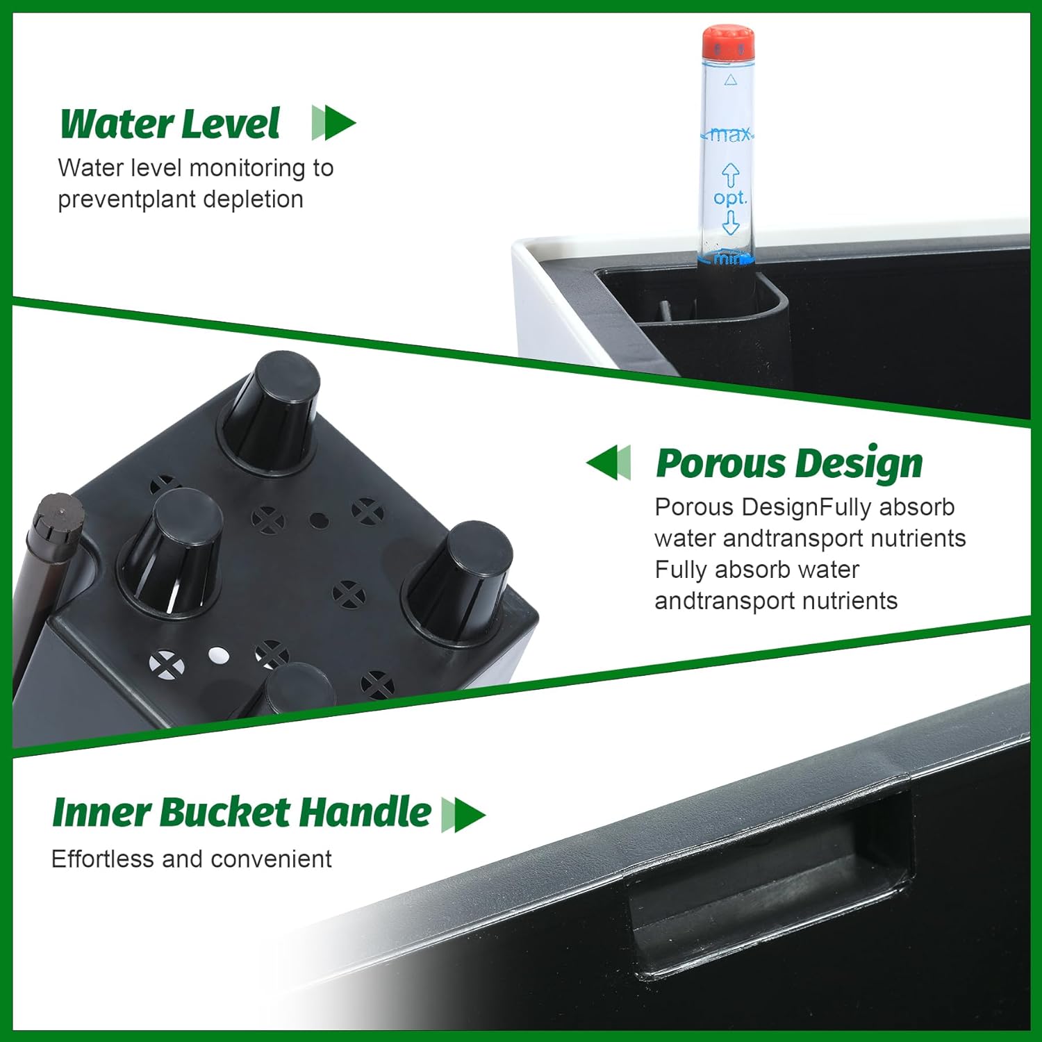• Water Level Monitor: This set includes two 16-inch elegant planters designed for outdoor plants with two water level monitors. The water level monitors allow you to easily keep track of the amount of water remaining in the pots, and you can easily watch the monitor's water level line high or low to water, saving you up to two weeks of watering time