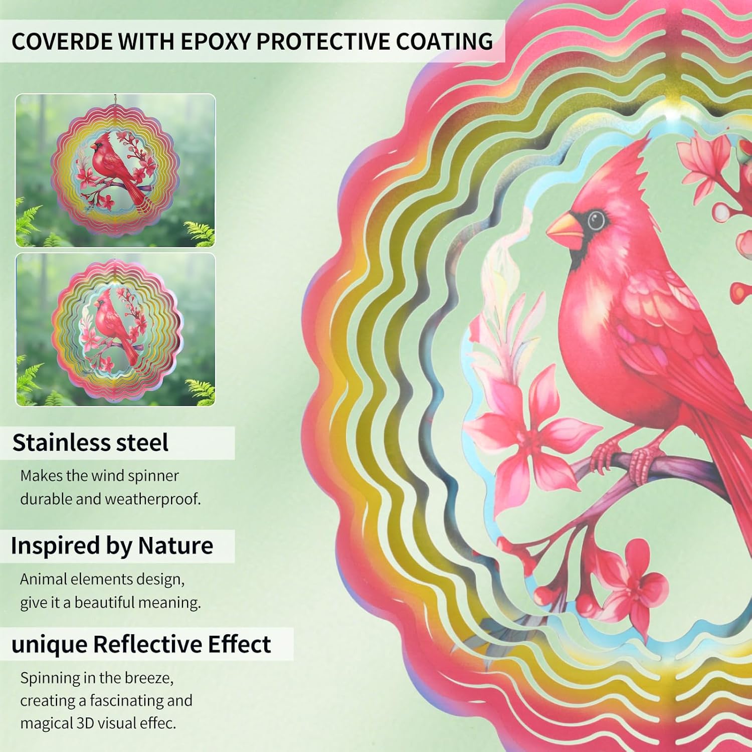 • 12inch 3D Cardinal Bird Wind Spinner Outdoor Decor - Cawalap Cardinal Bird Metal Wind Spinner is made from Sturdy stainless steel material by laser-cutting technology to form vivid shape, makes it flexible and strong, is individually hand painted by epoxy protective coating with colorful sparkle powder inside to highly resist weather and rust. a frosted paint finish, giving off a sparkling when it spin. The unique design combined meaningful animal pattern and a 3D streamer effect.
