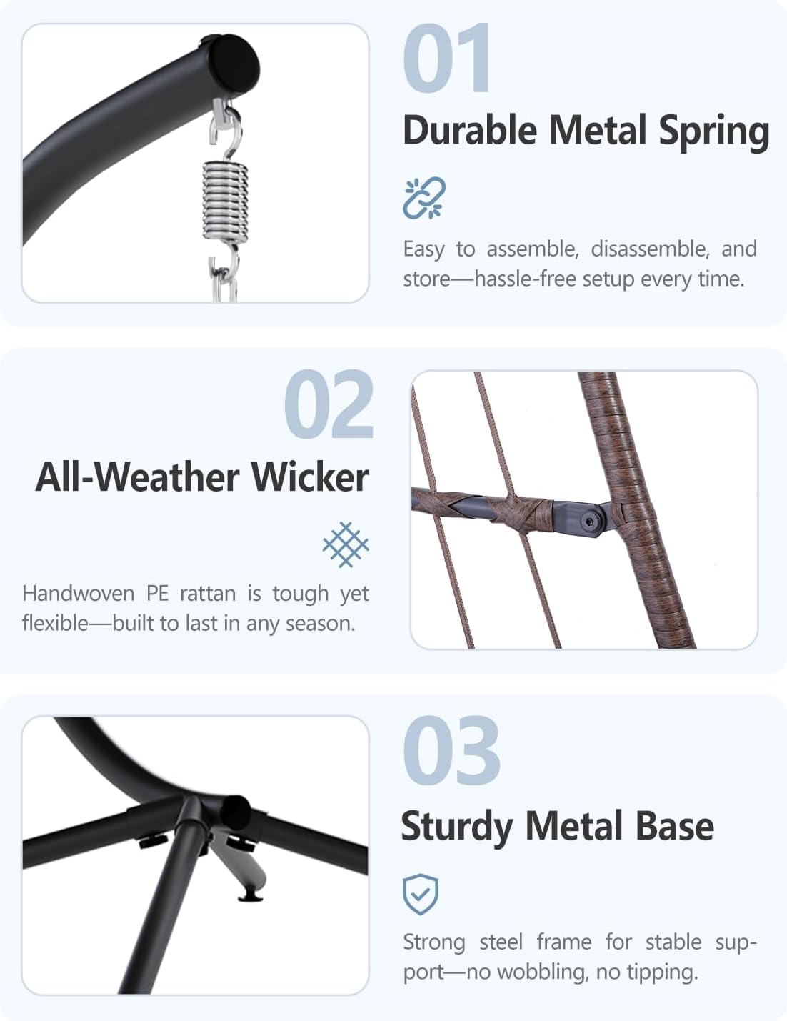 • Heavy-Duty & Rust-Resistant Build: Made with a powder-coated steel frame and hand-woven all-weather wicker, our hanging egg chair supports 350 lbs and resists rust, fading, and wear better than most outdoor egg chairs