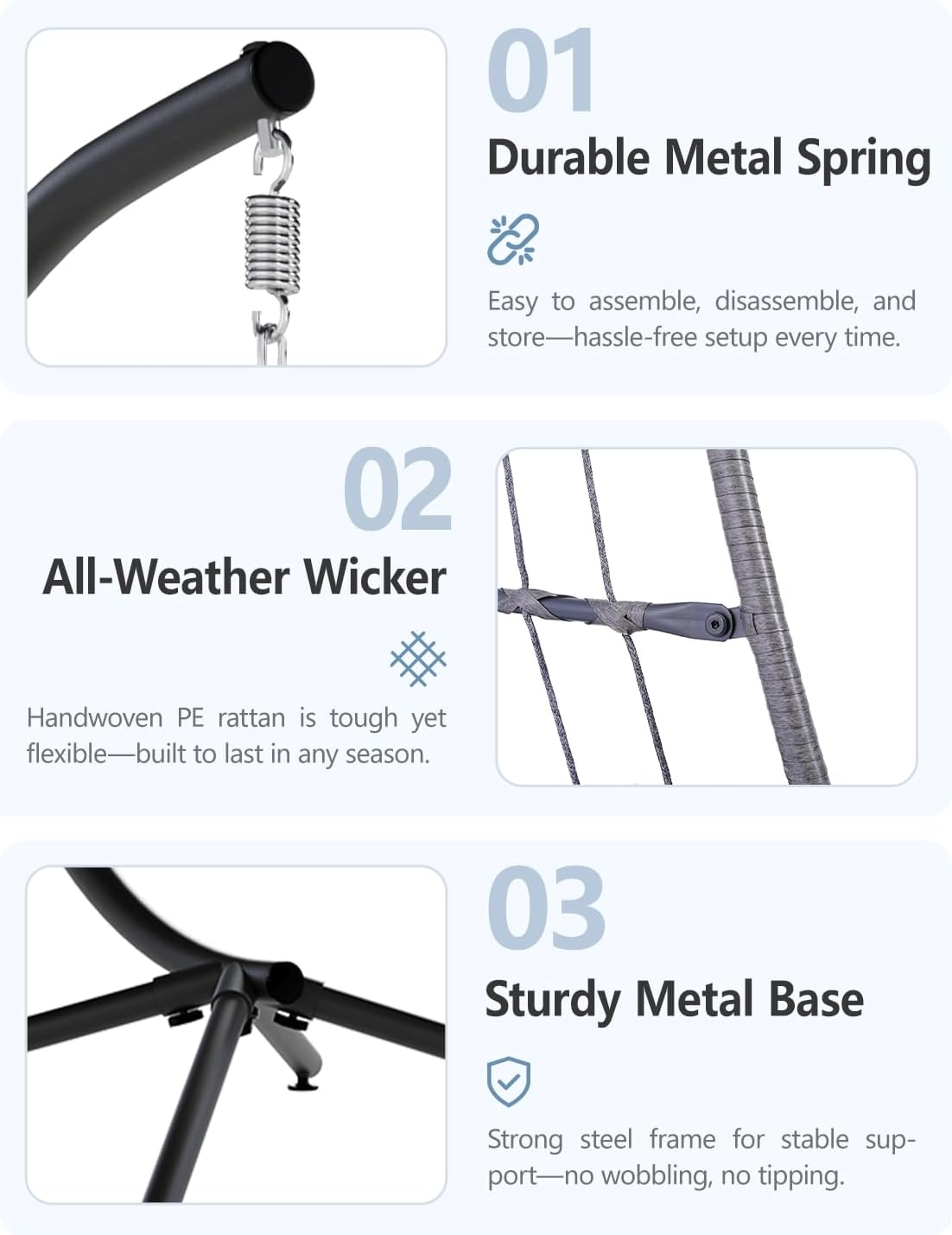 • Heavy-Duty & Rust-Resistant Build: Made with a powder-coated steel frame and hand-woven all-weather wicker, our hanging egg chair supports 350 lbs and resists rust, fading, and wear better than most outdoor egg chairs