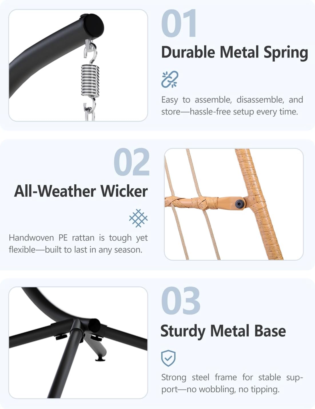 • Heavy-Duty & Rust-Resistant Build: Made with a powder-coated steel frame and hand-woven all-weather wicker, our hanging egg chair supports 350 lbs and resists rust, fading, and wear better than most outdoor egg chairs