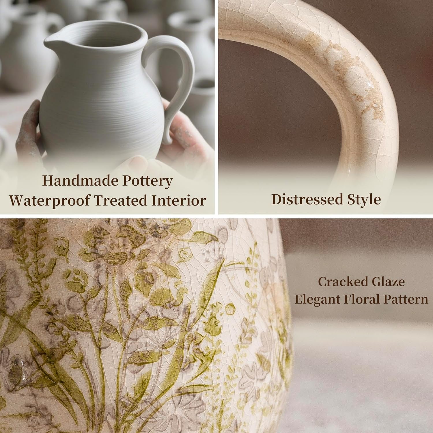 Vintage Green and Beige Ceramic Pitcher Vase with Handle, Farmhouse Floral Decorative Vase, Rustic Table Centerpiece for Home Decor, Living Room, French Country Grand Millennial Decor 8.7 in