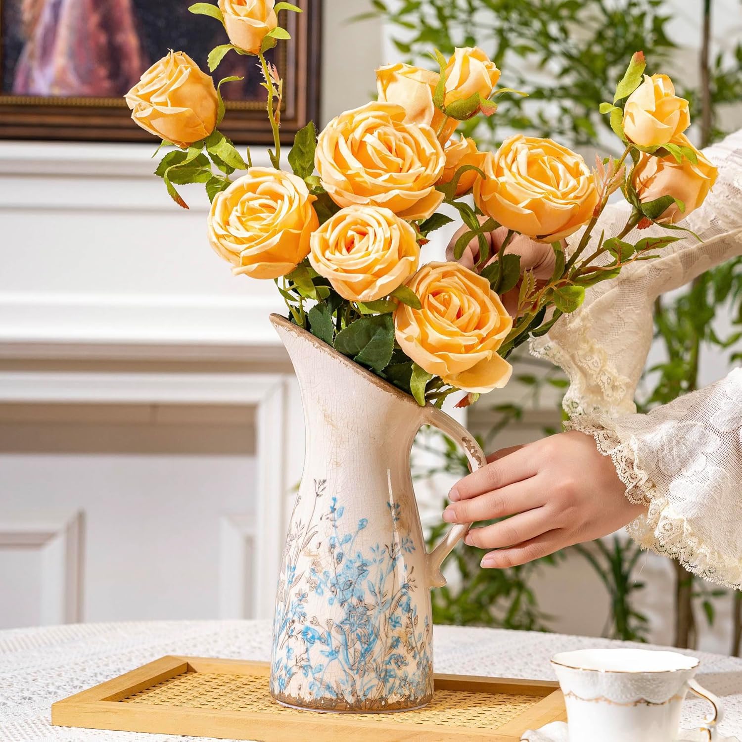Vintage Ceramic Pitcher Vase with Handle, Farmhouse Blue and Brown Large Floral Vases, French Country Decorative Vase, Rustic Table Centerpiece for Home Decor Living Room, Bookshelf, Office 10.5 Inch