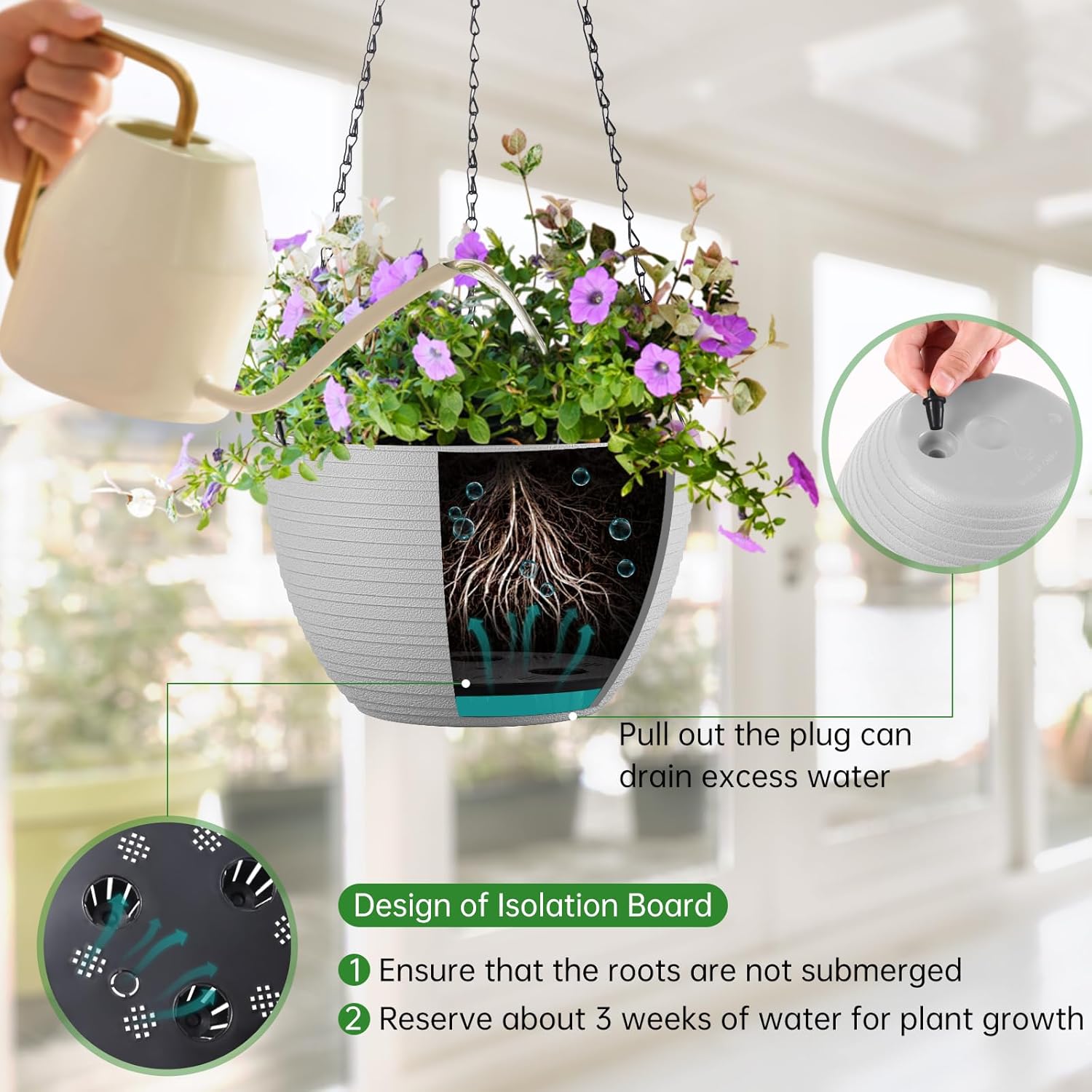 • Lazy self watering planting method reduces the trouble of daily watering, and high-level drainage hole prevent excessive drainage. Once water-storage can last for about 3 weeks