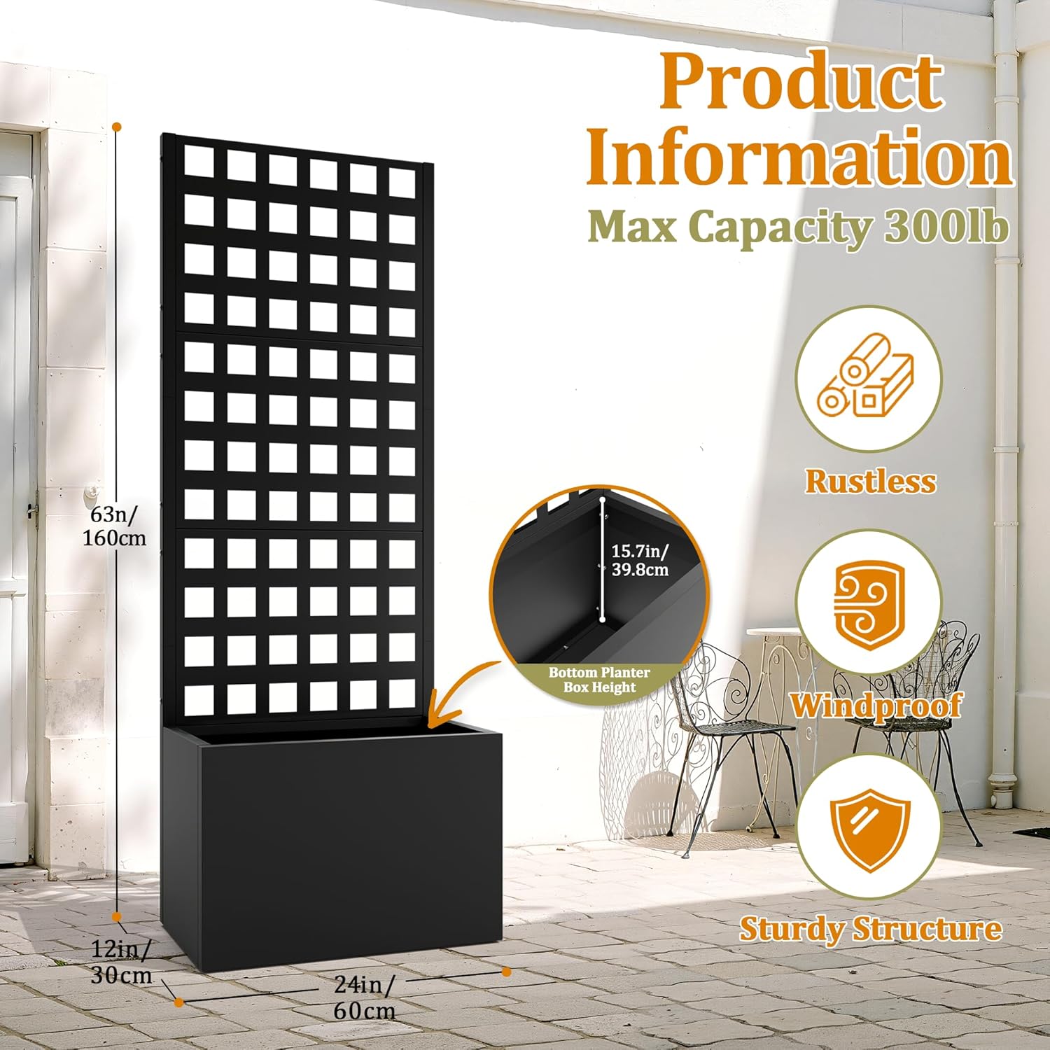 • 🛡️【Outdoor Privacy Screen & Metal Planter Box with Trellis】Use this metal planter box with trellis to create a natural divider on your patio, balcony, or yard. It’s more than just a garden raised bed for climbing plants—it’s also a beautiful metal planter with privacy screen that offers shade and separation. The sleek black frame and vertical lines of this metal planter box with trellis make it both decorative and practical.