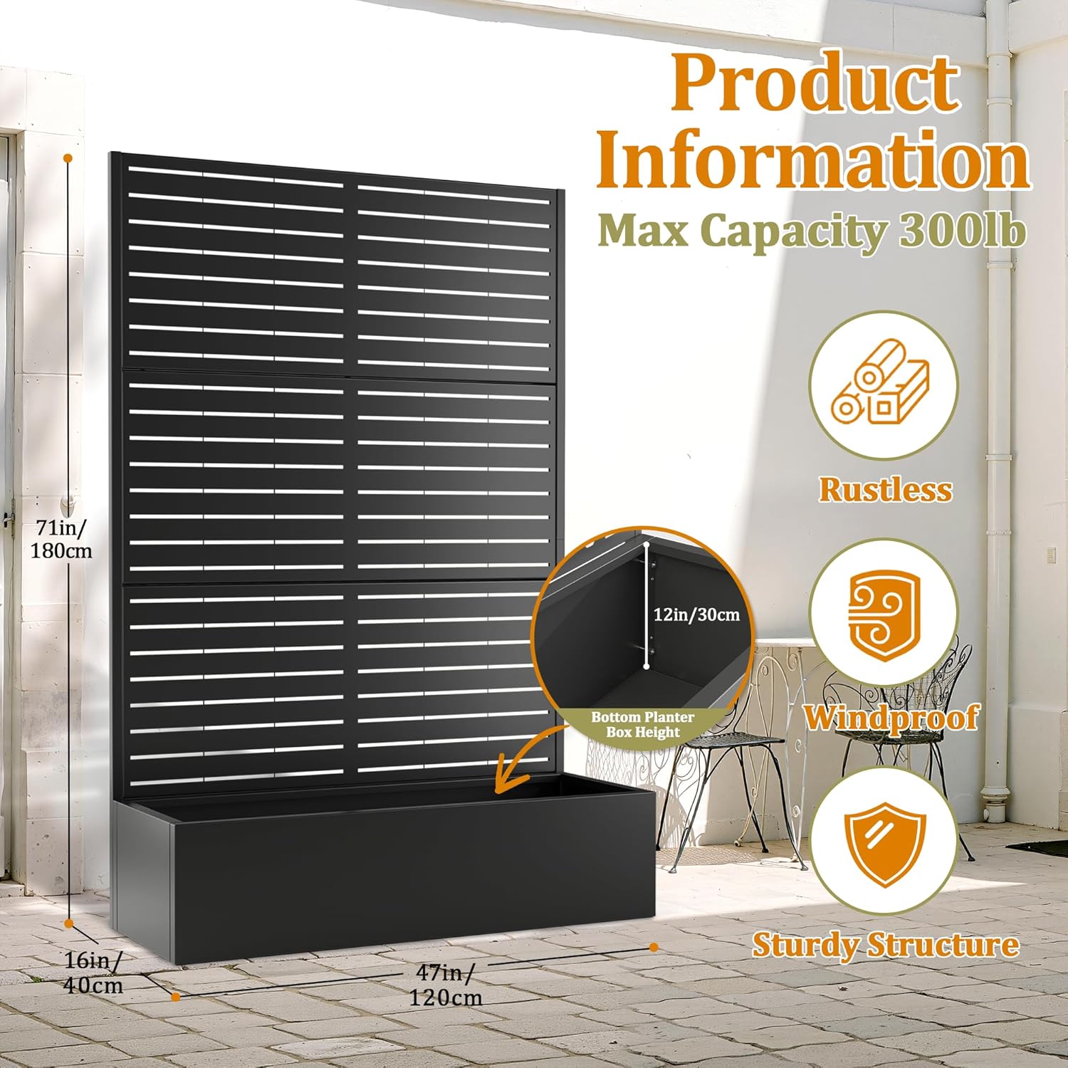 • 🛡️【Outdoor Privacy Screen & Metal Planter Box with Trellis】Use this metal planter box with trellis to create a natural divider on your patio, balcony, or yard. It’s more than just a garden raised bed for climbing plants—it’s also a beautiful metal planter with privacy screen that offers shade and separation. The sleek black frame and vertical lines of this metal planter box with trellis make it both decorative and practical.