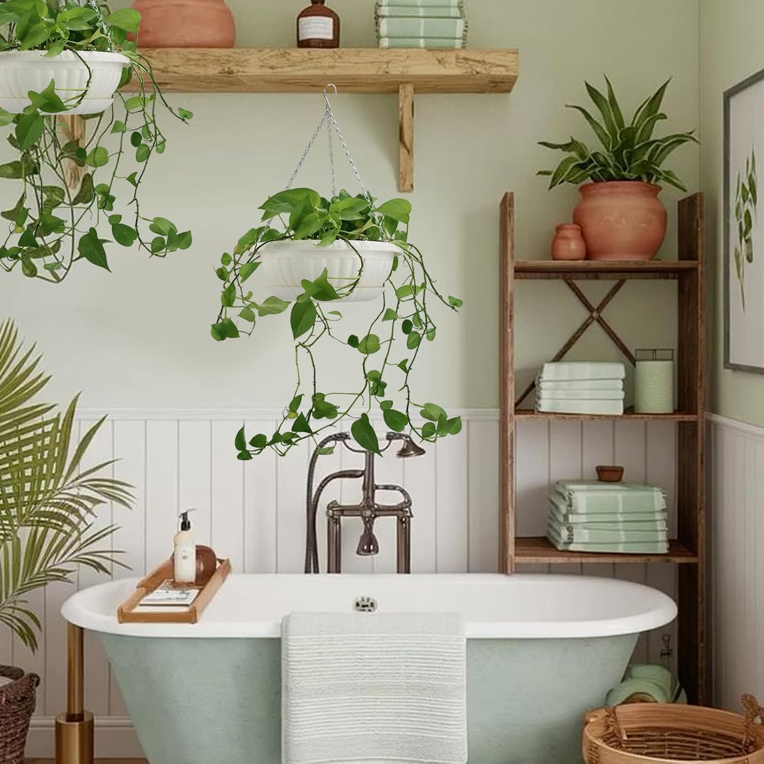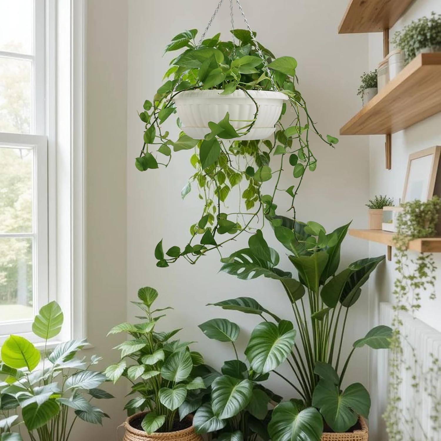 • Plant baskets are made of high quality plastic, light-weight. Coated metal chain, not easy to rust.