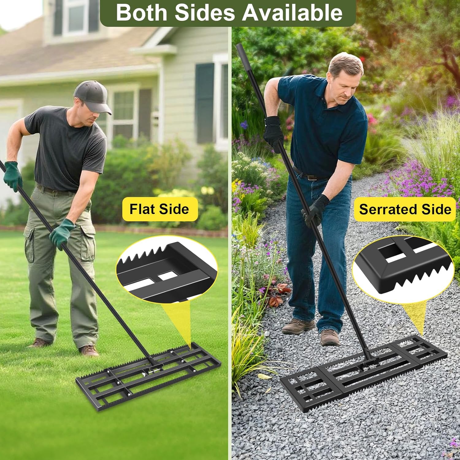 • Dual-Sided Design: This lawn leveling rake features a flat side for smooth soil gliding and a serrated edge for breaking up tough clumps! Saving you time and effort. Ideal for soil spreading, seeding, turf repair, sand leveling, and gravel smoothing.