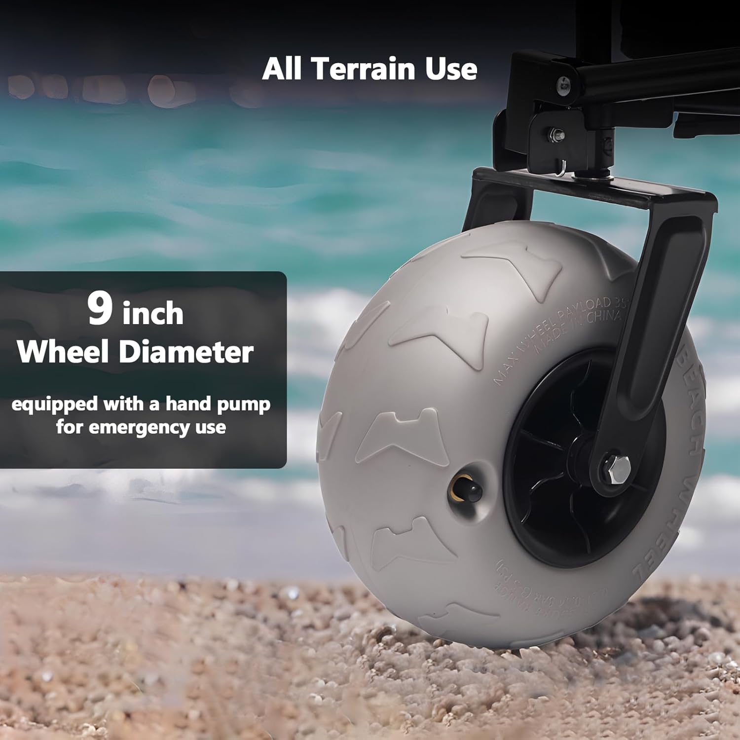 • 【9" Balloon Tires】-The beach wagon is adopted 9-inch balloon tires for better riding experience. Inflatable tires undergo 24-hour quality inspection and come with a manual pump for emergency use.