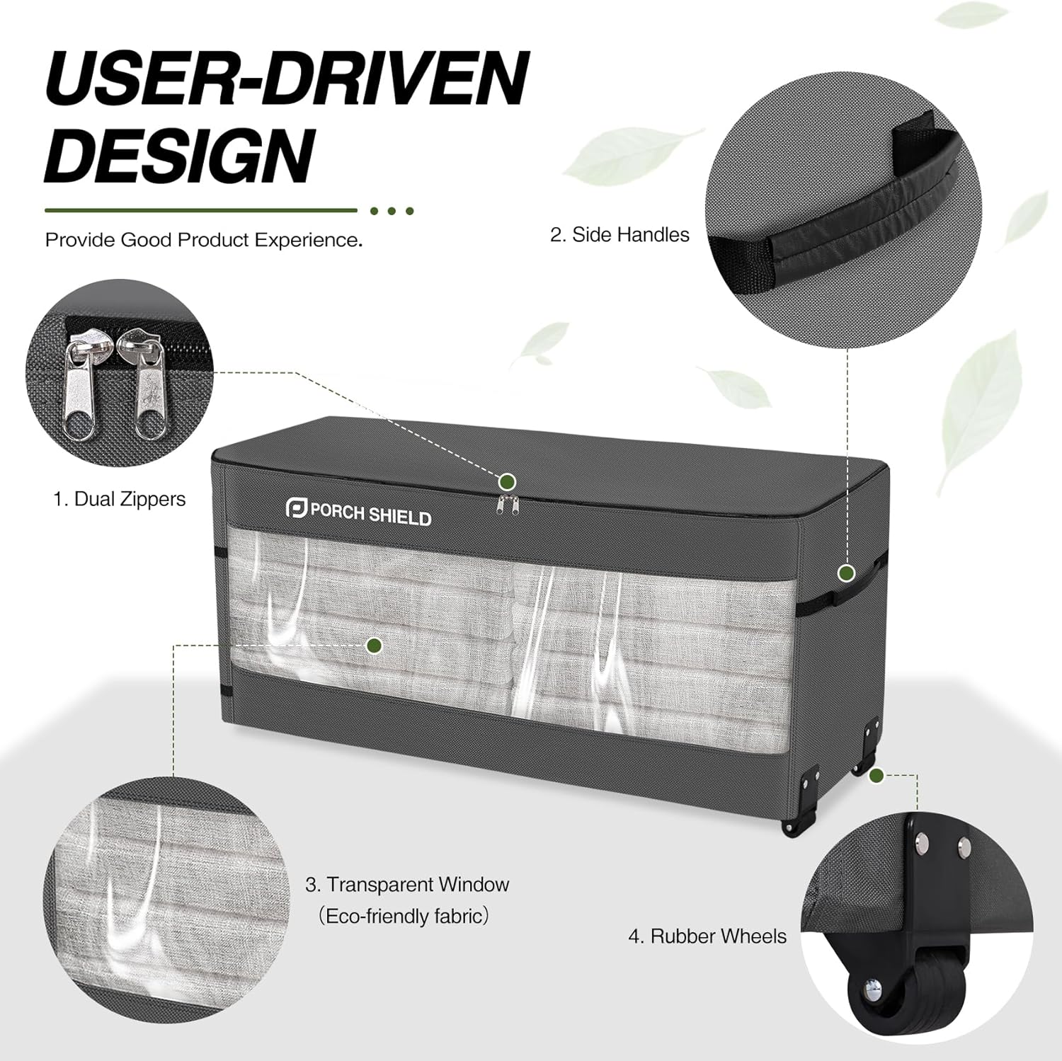 • 【Dimensions】 Porch Shield rolling cushion storage bag with wheel is 62"L x 20"W x 28"H, which fits patio chair cushion, pillow, 9 FT Christmas tree, festival decoration and more. Large cushion bag can hold 16 cushions as reference and more depending on thickness.