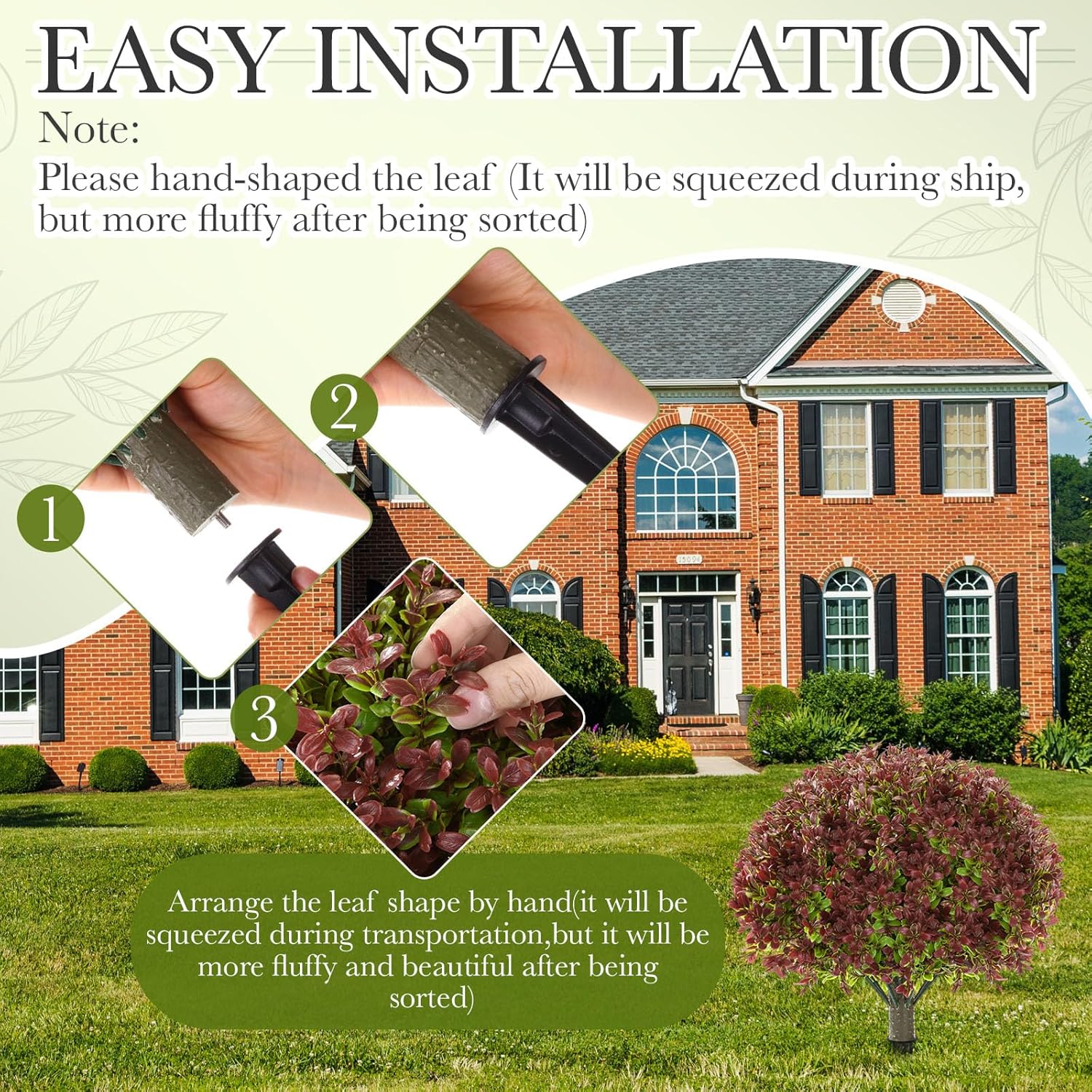 • Easy Installation: after assembly, you may need to manually adjust the leaves to achieve the desired shape; The design of the ground spike allows you to easily insert it into soil, grass or flowerpot without additional tools, making the installation simple and the placement flexible; If any leaves fall off during unpacking, just reattach them to the branches effortlessly