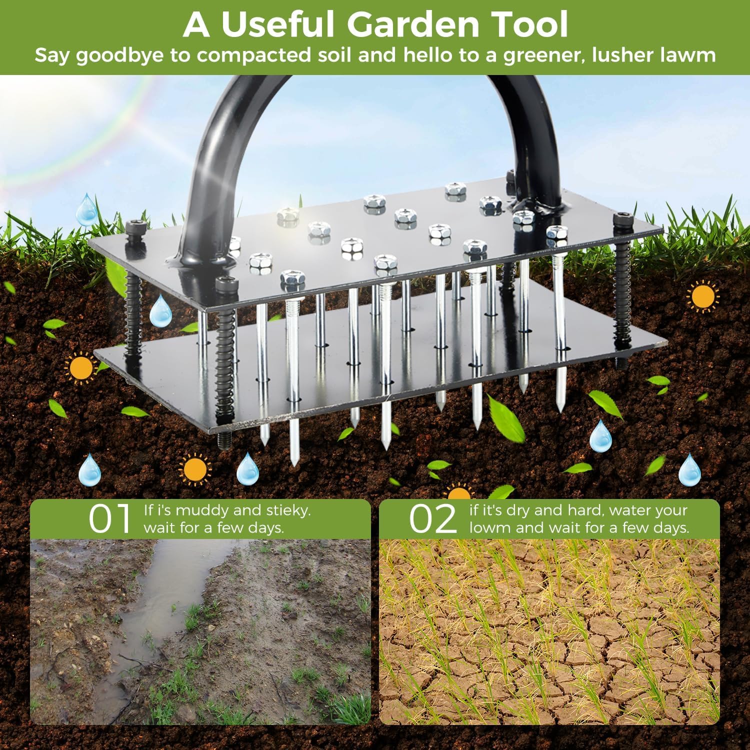 • 🍀Hand Aerator Lawn Tool: The lawn aerator can easily penetrate the bottom layer of the soil for thorough aeration, allowing air (oxygen), water and nutrients to reach the grass roots, ensuring uniform loosening and promoting healthier lawn growth. Aerator tool, help you have a healthier, beautiful and vibrant lawn/garden/yard/terrace.