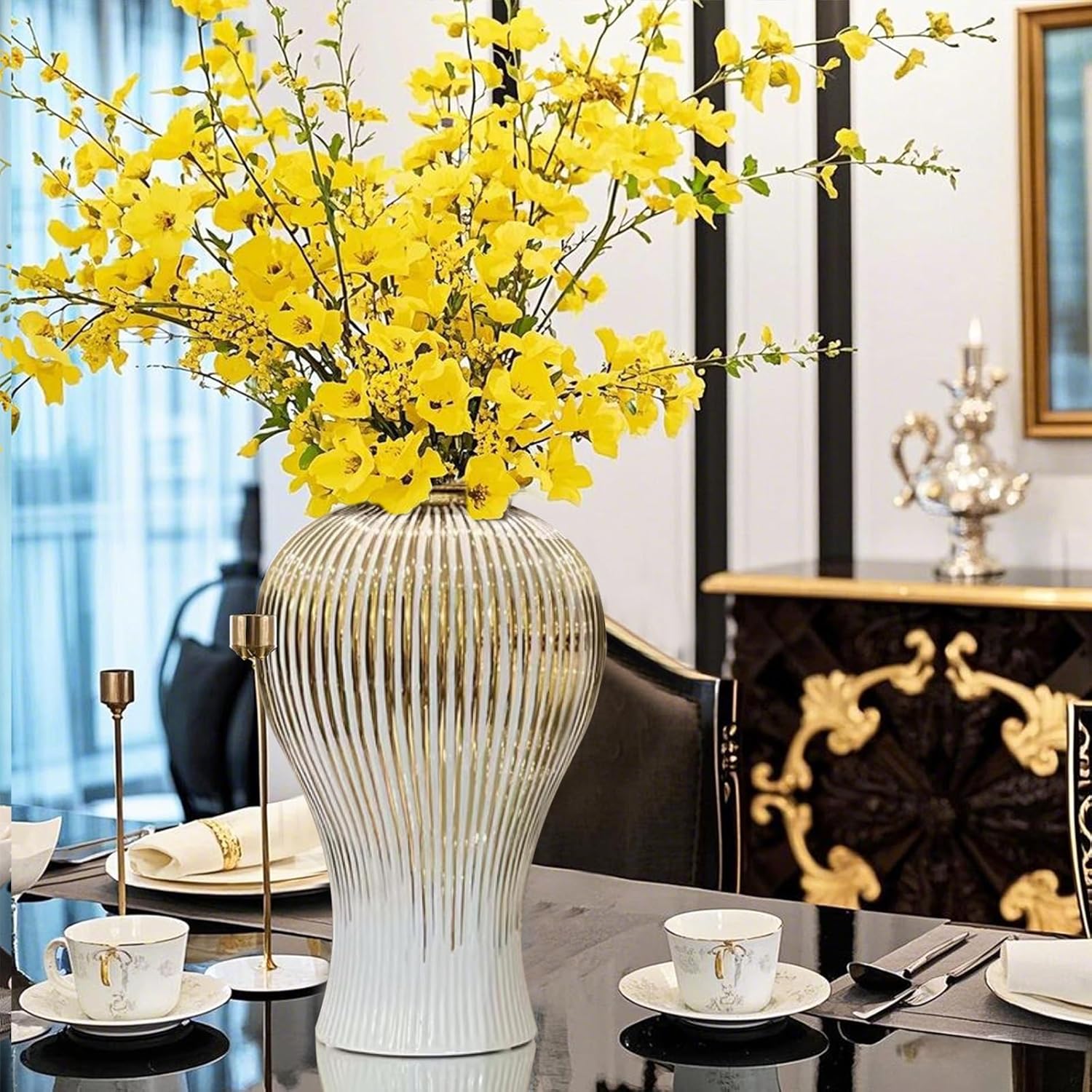 • 【Modern Gold and White Vase】Classic for your home decor. White Glossy Smooth Glazed Surface with gold trim fit for most home decor collections. Work great with your exotic houseplants, florals, and beautiful bouquet.