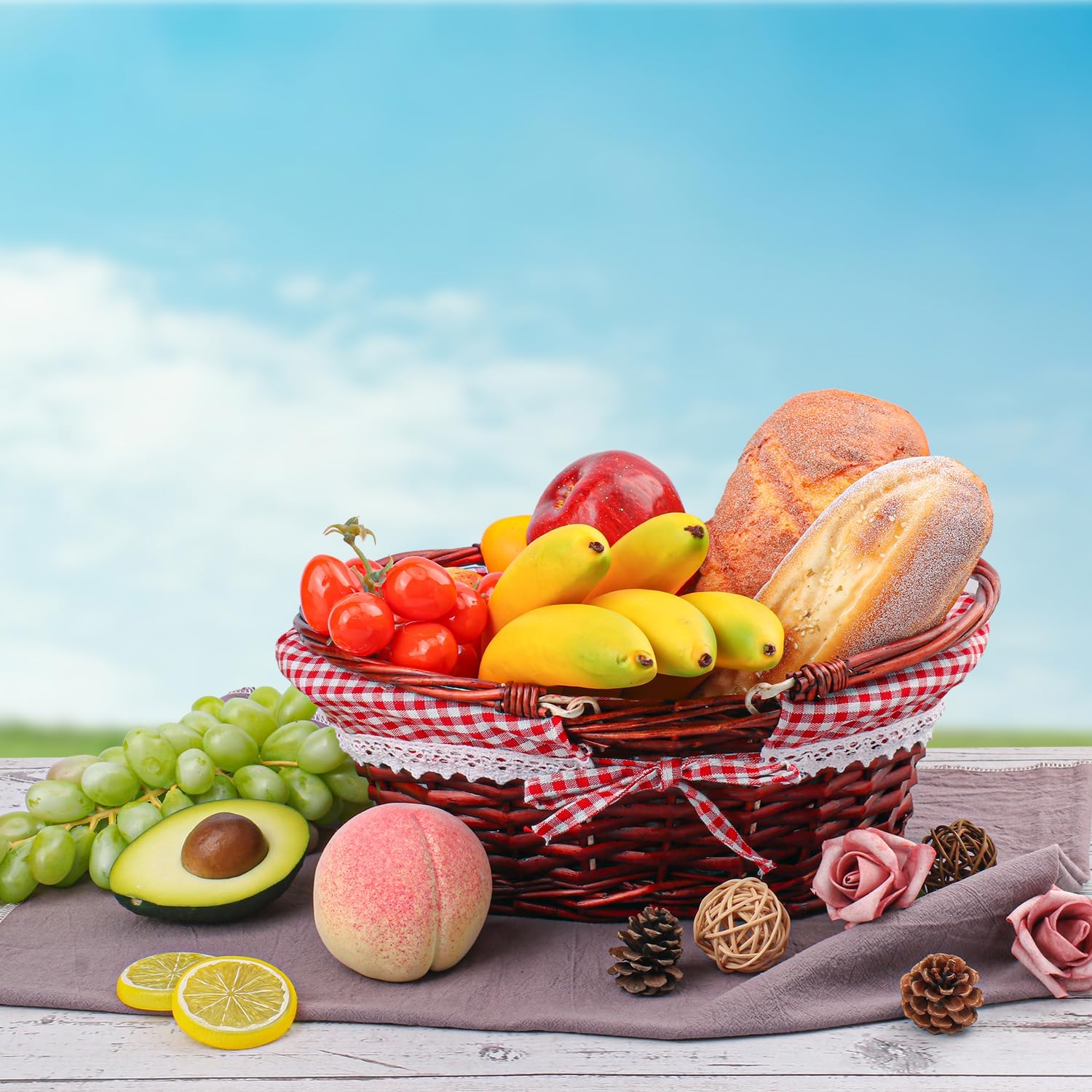 2 Pack 12.6 Inch Brown Wicker Basket with Checkered Lining, Oval Wicker Woven Basket with Handle, Willow Woven Picnic Baskets for Picnic, Camping, Party(Small)