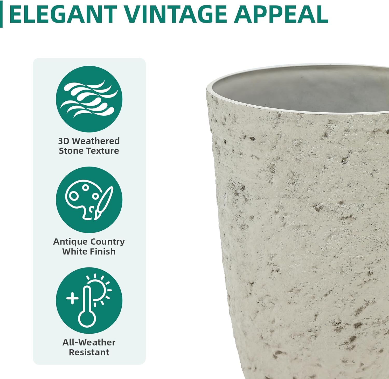 • Timeless Rustic Charm: Showcasing an antique country white finish and 3D weathered stone texture detailing, these tall planters bring a touch of vintage charm. It can effortlessly elevate the character of your front porch, patio or living room.