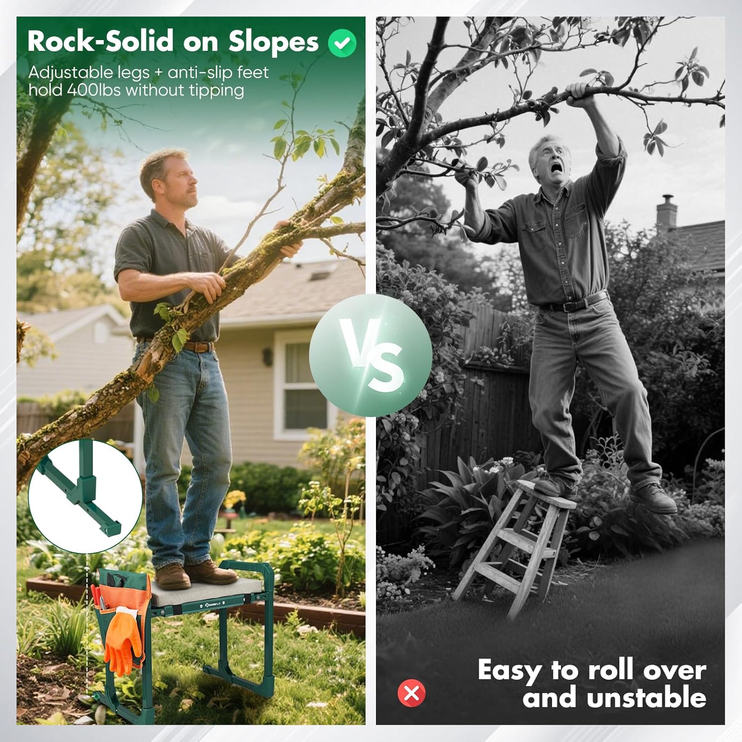 • ⚙ 【Adjustable Legs for Uneven Terrain】 Built with extendable support legs and non-slip rubber feet, this Sakerplus kneeling chair adapts to slopes, gravel, or soft soil. Designed to help maintain stability while planting in raised beds or trimming hedges, even on uneven ground.