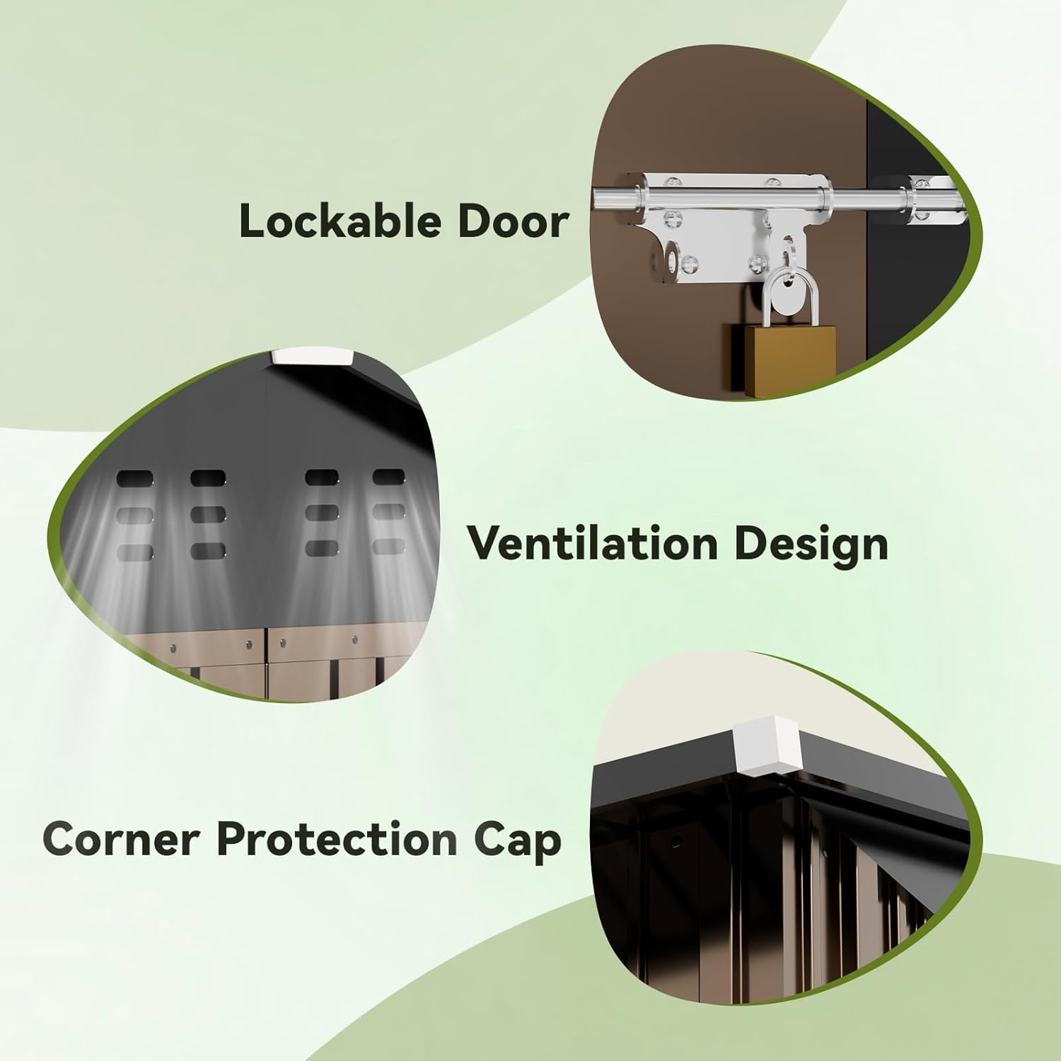 • Lockable Door and Vents:The lockable door provides security,keeps your tools away from being stolen,and avoids small animals from entering accidently;Two Top Vents for Better Airflow,Keeping the Space Cool and Odor-Free