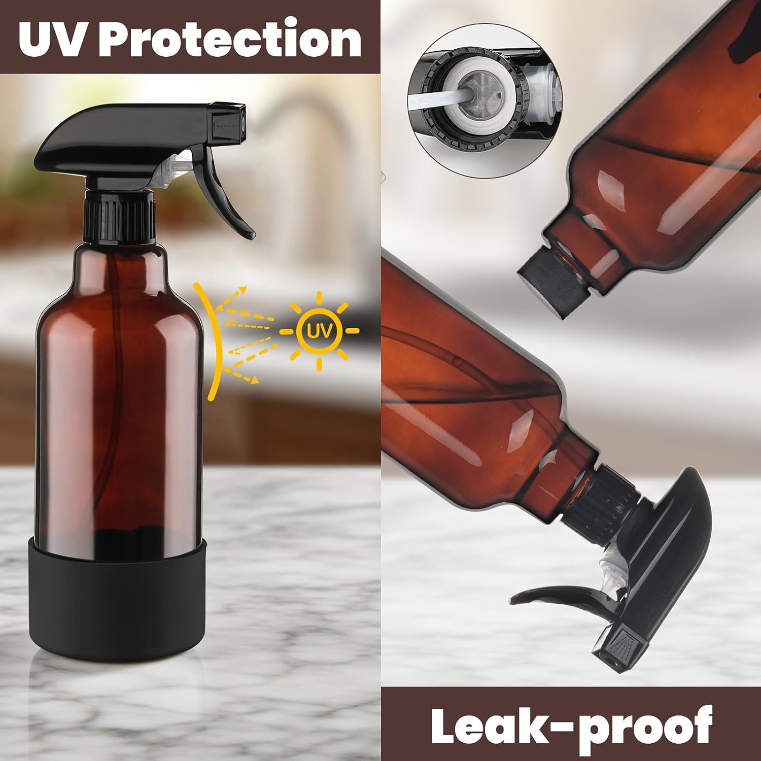 • Amber bottle: Our spray cleaning bottles are dark brown to prevent UV degradation, ensuring the safety of your essential oils. The included silicone sleeve minimizes the risk of breakage and slipping, making it safe for daily use