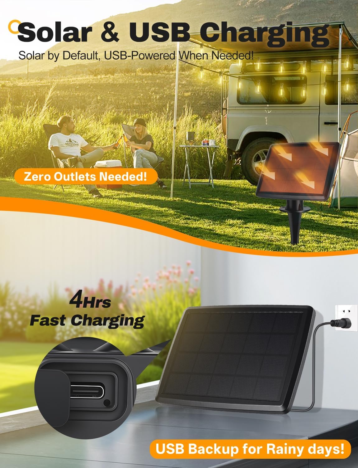 • Solar + USB Dual Charging:quipped with a high-efficiency solar panel that energy efficiency increased by 20%,it can be fully charged in just 6H on sunny day.What about consecutive cloudy or rainy days? Usb 4H fast charging is super convenient.Both Both methods keep your backyard or balcony lit for over 10H every night! No need to lay wires,don't worry about cloudy days and power outages,eco-friendly and hassle-free,Your outdoor space stays lit 365 days a year.