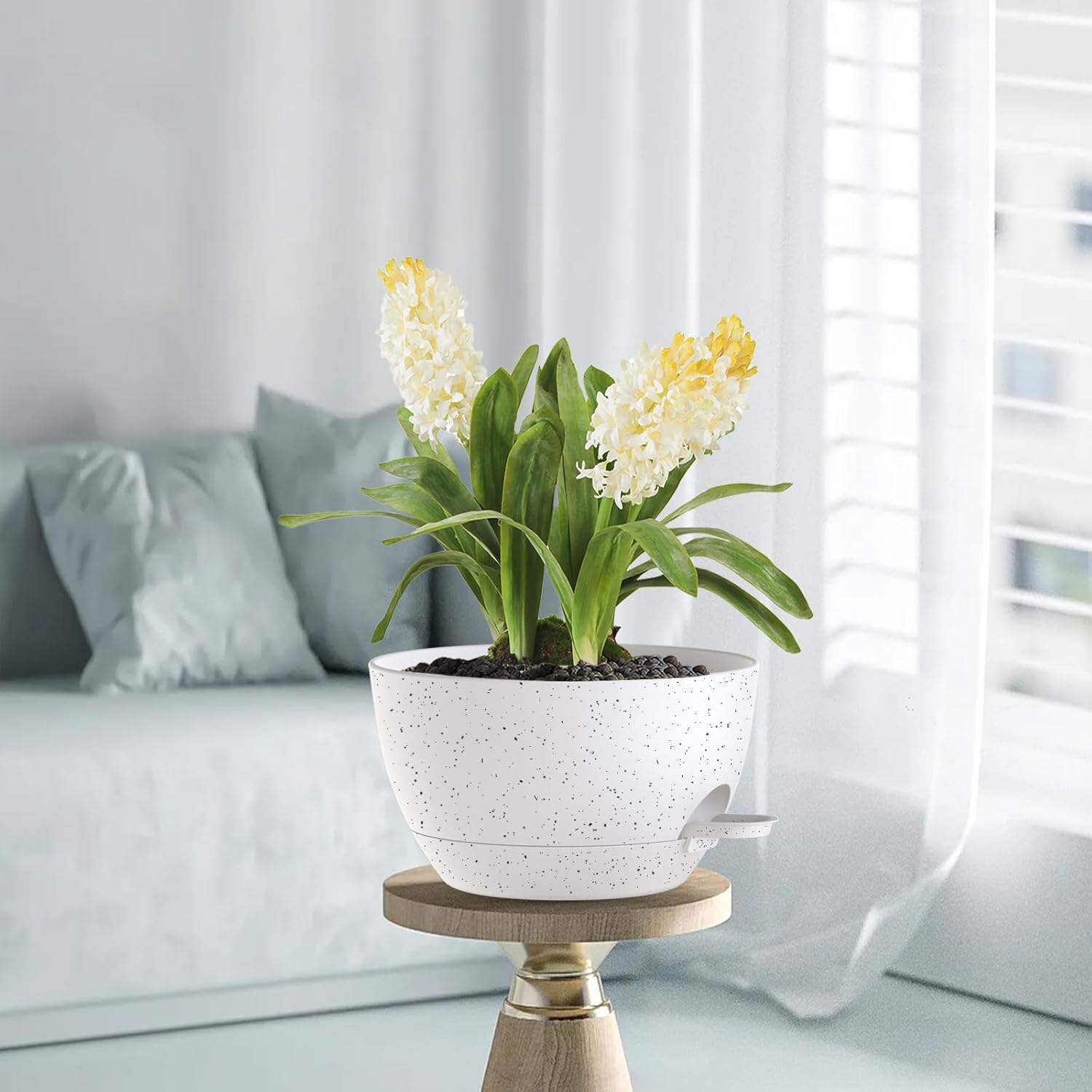 • 【Ventilation & Drainage】12-Inch self-watering hanging planter has multiple drainage holes between the planter and the tray, which can effectively drain and ventilate the plant. It can drain excess water and prevent overwatering, which is beneficial to promote the respiration of plants