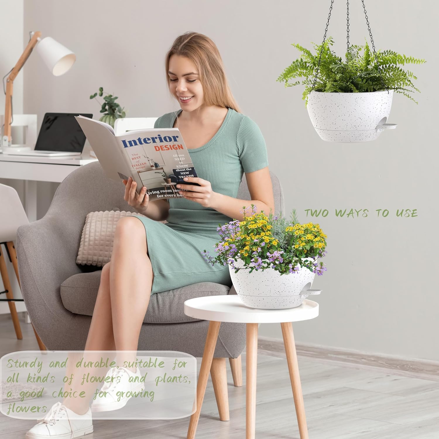 • 【Self-Watering Hanging Flower Pots with Removable Saucer】the appearance and structural design of the Hanging Pot prevents overwatering and acts as a water reservoir to promote Plant growth. It is suitable for a variety of Hanging Pot Plants, such as ivy, Herbs, Ferns, Philodendrons, Succulents, Flowers or other Plants
