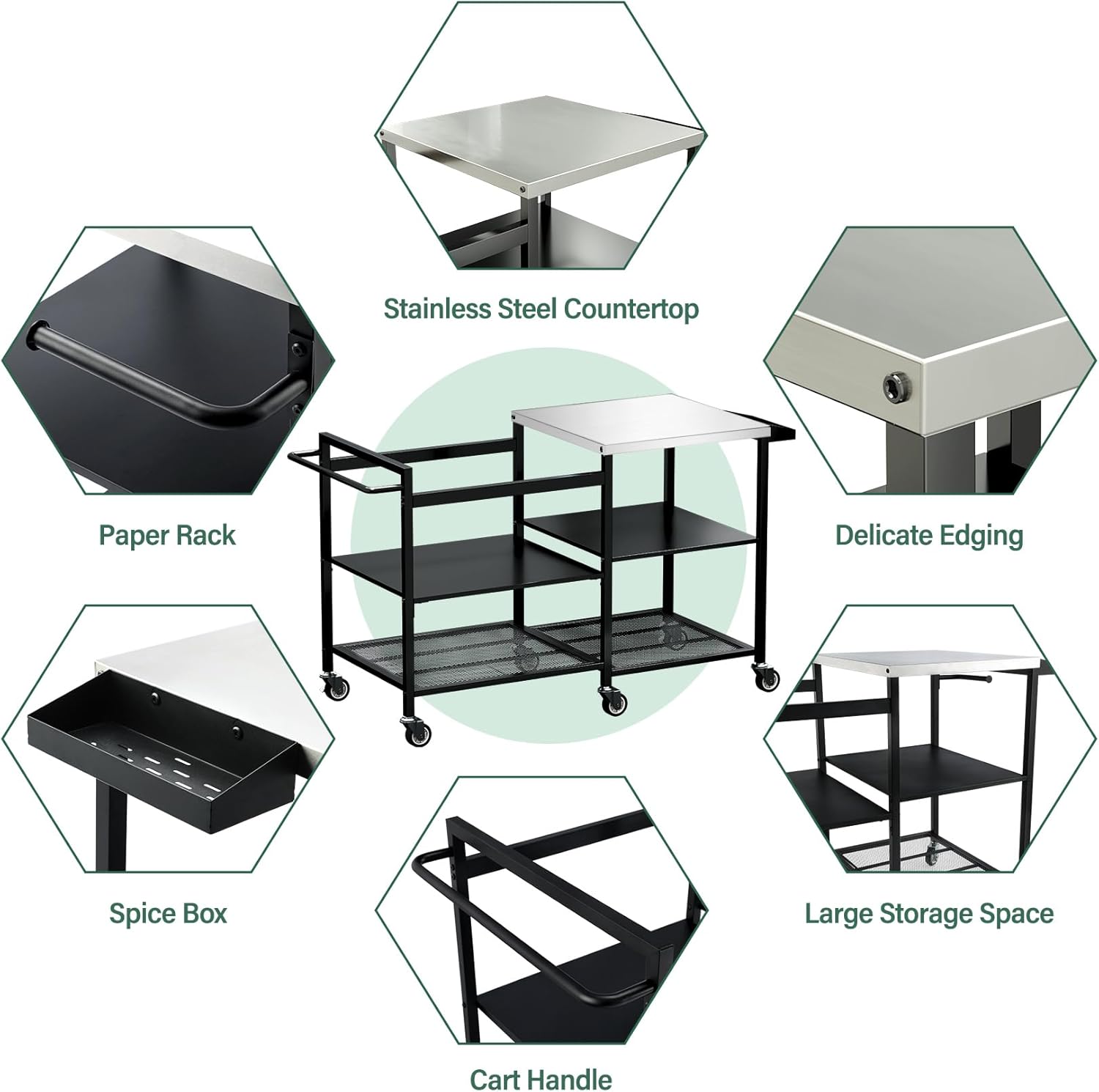 • 【Ample Storage Space】The cart offers versatile storage options. In addition to the stainless steel prep top, it features three big shelves for organizing utensils, ingredients, charcoal, and more. The side is a spice rack and a paper towel holder—so your seasonings and paper are always easy to reach. Everything stays neat and close by, making your cooking easier and more efficient.