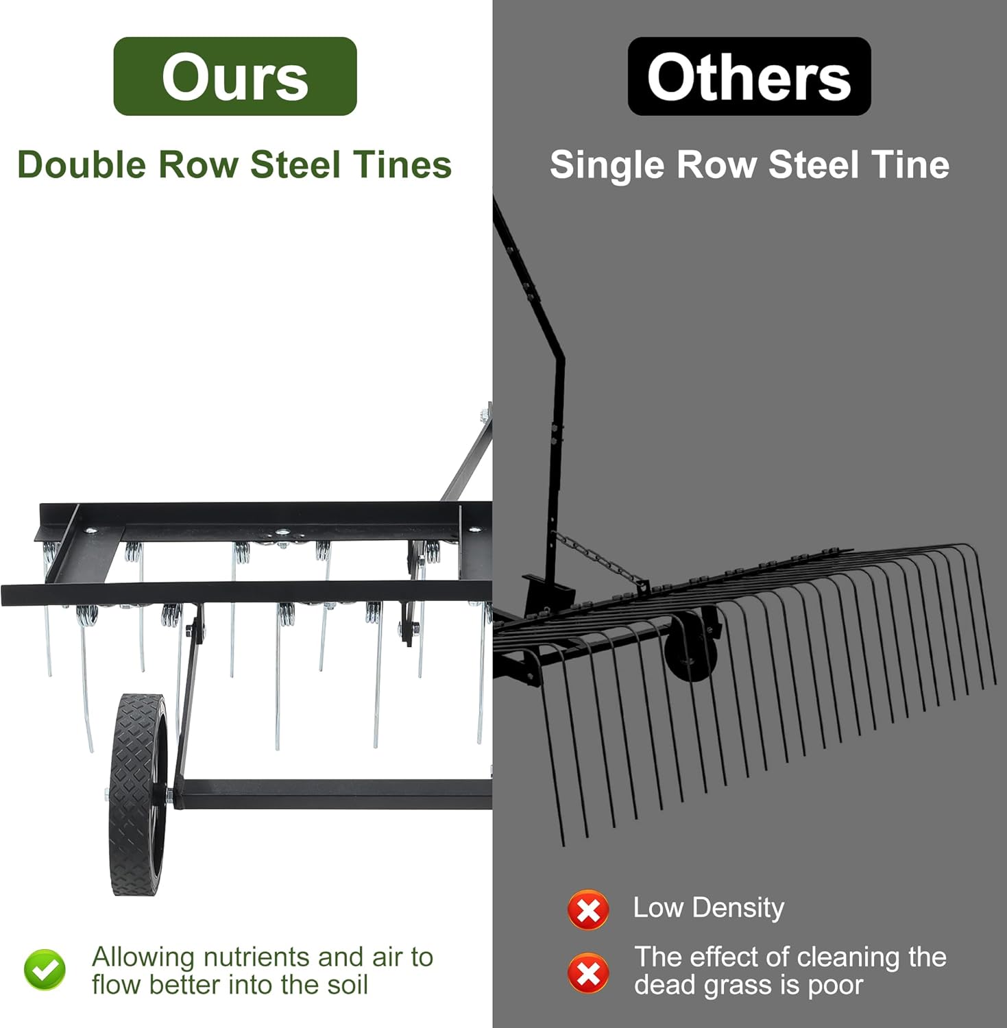 • Dual-Row Steel Tines for Deep Cleaning:Equipped with 2 rows of 20 flexible steel tines, this lawn dethatcher effectively removes matted grass and thatch from the root level, allowing your lawn to breathe freely. The cleverly designed tines loosen and lift the thatch, creating optimal conditions for healthier lawn growth, promoting lush, green, and vibrant grass.