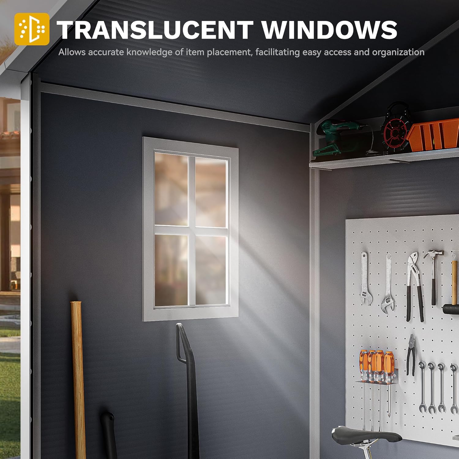• [Heavy-Duty Floor] The backyard storage shed features a 12mm thick double-wall resin floor that adds extra protection to ensure stored items remain clean and dry; The durable PVC floor is wear-resistant and capable of supporting heavy equipment, enhancing the stability of the flat surface