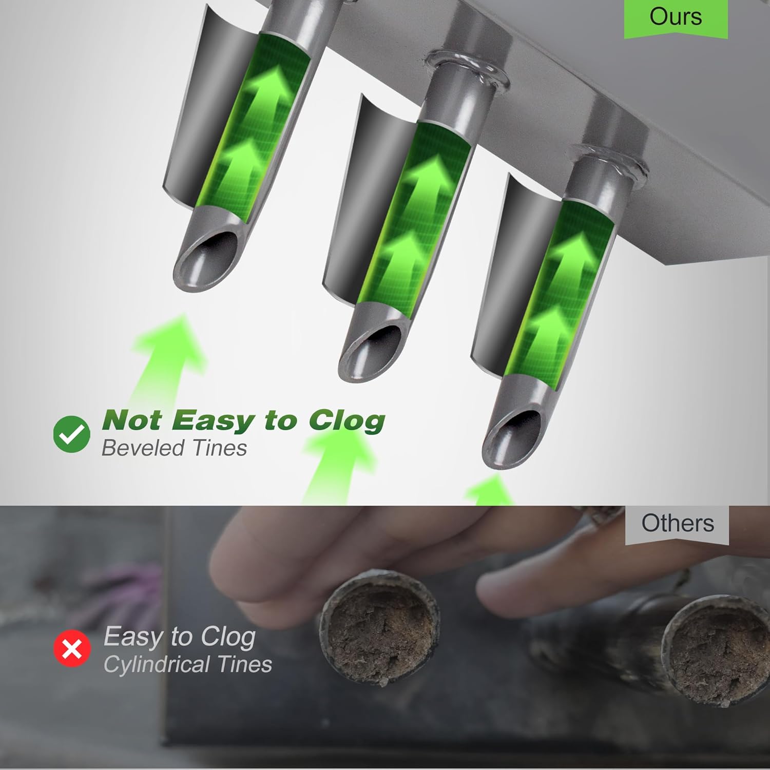 • 3 Special Coring Tines: Walensee lawn plug aerator is equipped with 3 tines featuring a tapered, beveled round tube design. The diameter gradually increases from small to large, followed by a straight tube, allowing the tool to smoothly penetrate the soil up to 4 inches and reduce the risk of clogging. This design also helps expel any old soil trapped inside the tube when the aerator is pulled out, ensuring both old and new soil are efficiently removed for a cleaner, more effective aeration.