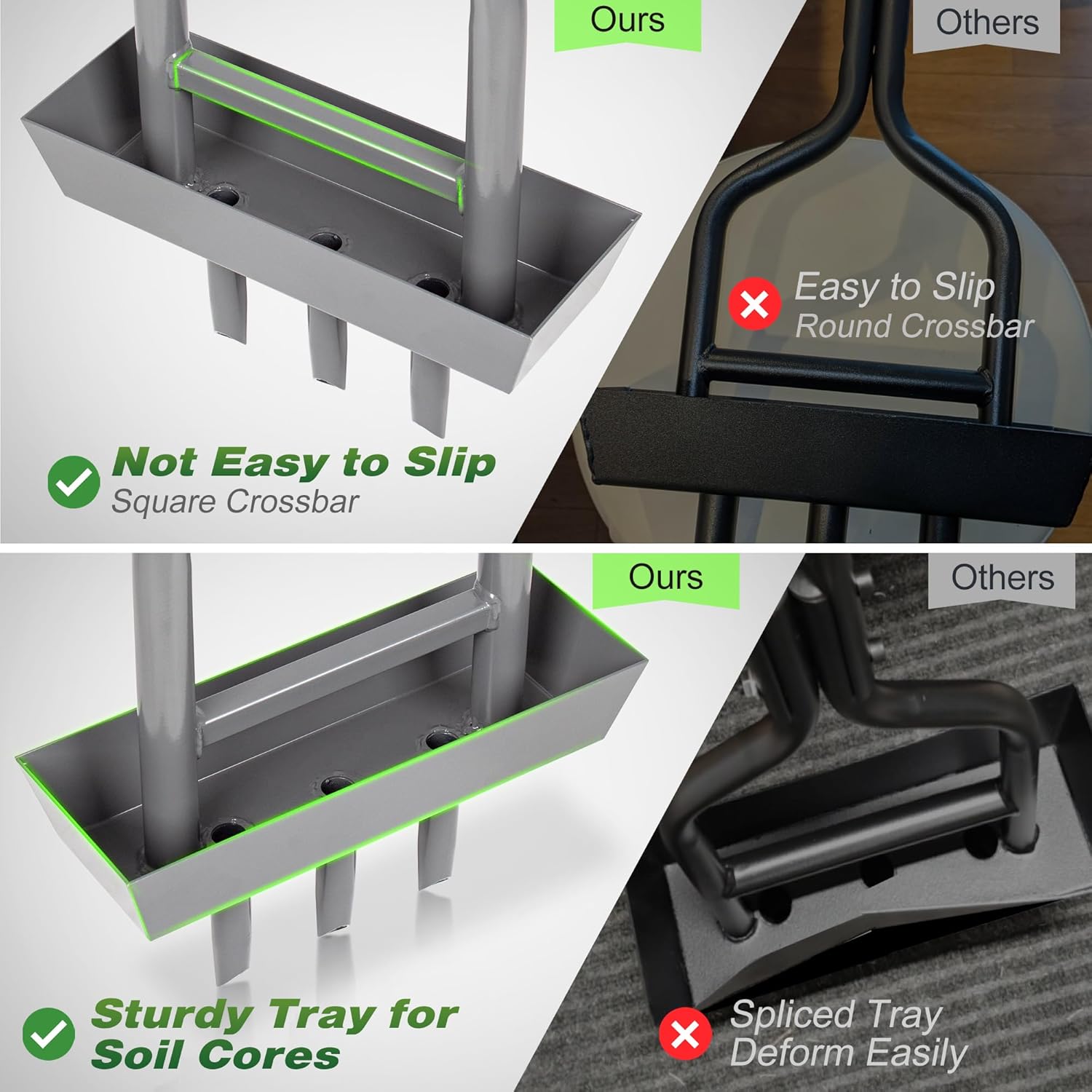 • Sturdy and Durable Structure: The lawn coring aerator is expertly crafted from high-quality painted metal, ensuring long-lasting durability and reliable performance while being rust-resistant for extra longevity. In addition, the tray which made from a single sheet of metal positioned 3.2 inches above the foot space, preventing accidental bending from stepping on the edges. This design enhances the overall strength and stability, making it ideal for frequent lawn care tasks.
