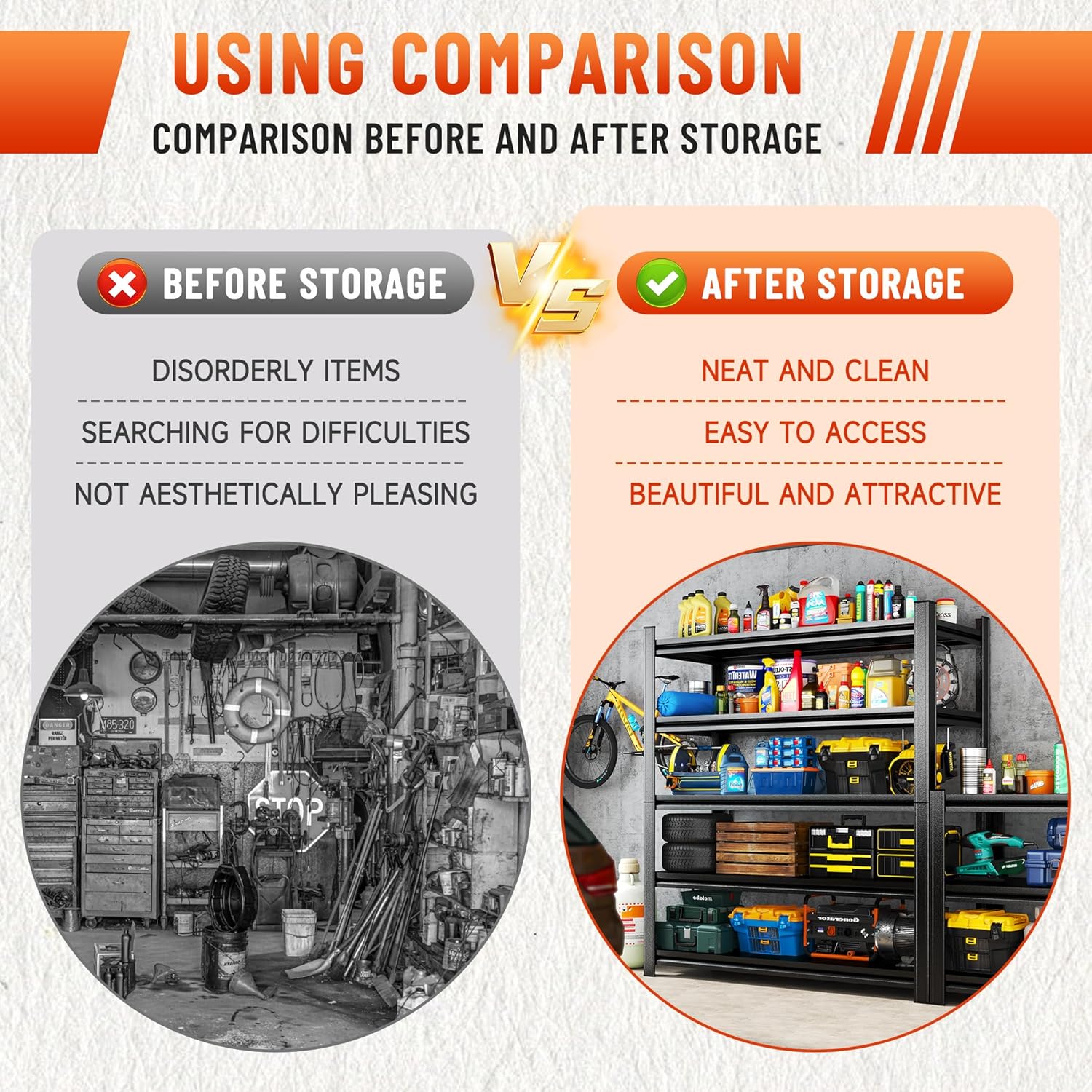 • 【Flexible Height Adjustment, Greatly Improve Space Utilization】This garage shelf can freely raise and lower the height of the five tiers of boards through the design of micro-adjustable slots, which can accurately match the different sizes of items from toolboxes and paint buckets to engines, containers and other items, and improves the utilization rate of each tier! The garage shelves are designed with tool-less adjustments, locking with the push of a finger, no need to remove bolts, and switching can be done in less than 30 seconds.