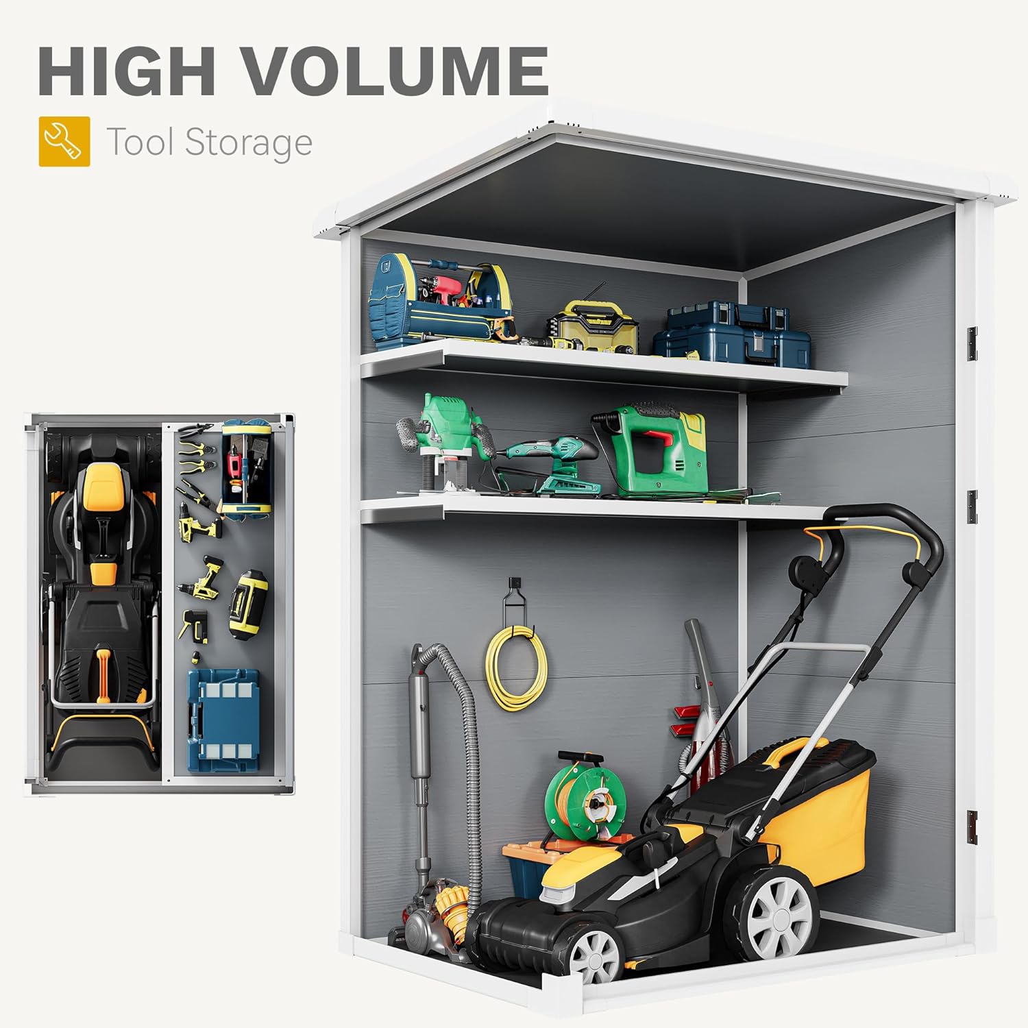 • Easy and Safe Access: This garden shed outdoor storage features double doors (23.6''L x 53.5''H each) for easy entry, even for large items; The lockable latch (lock not included) adds extra security for backyard, garage, or patio storage.Please note that for logistical purposes, the product will be delivered in two packages that may arrive at different times