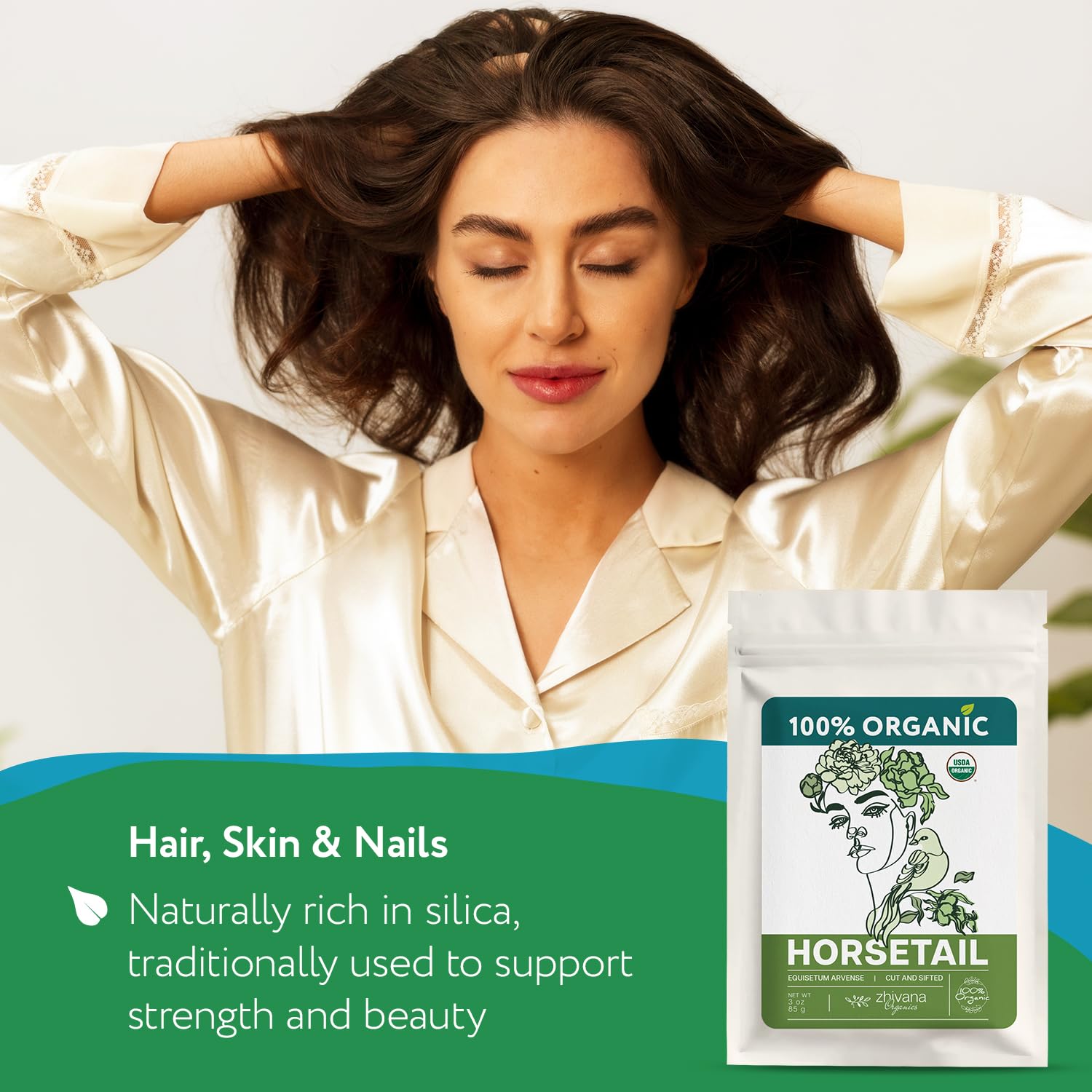 • 🌿 Traditionally Used in Herbal Practices – Horsetail has been historically used in wellness traditions for its naturally occurring silica and is often included in herbal infusions associated with supporting beauty and vitality.