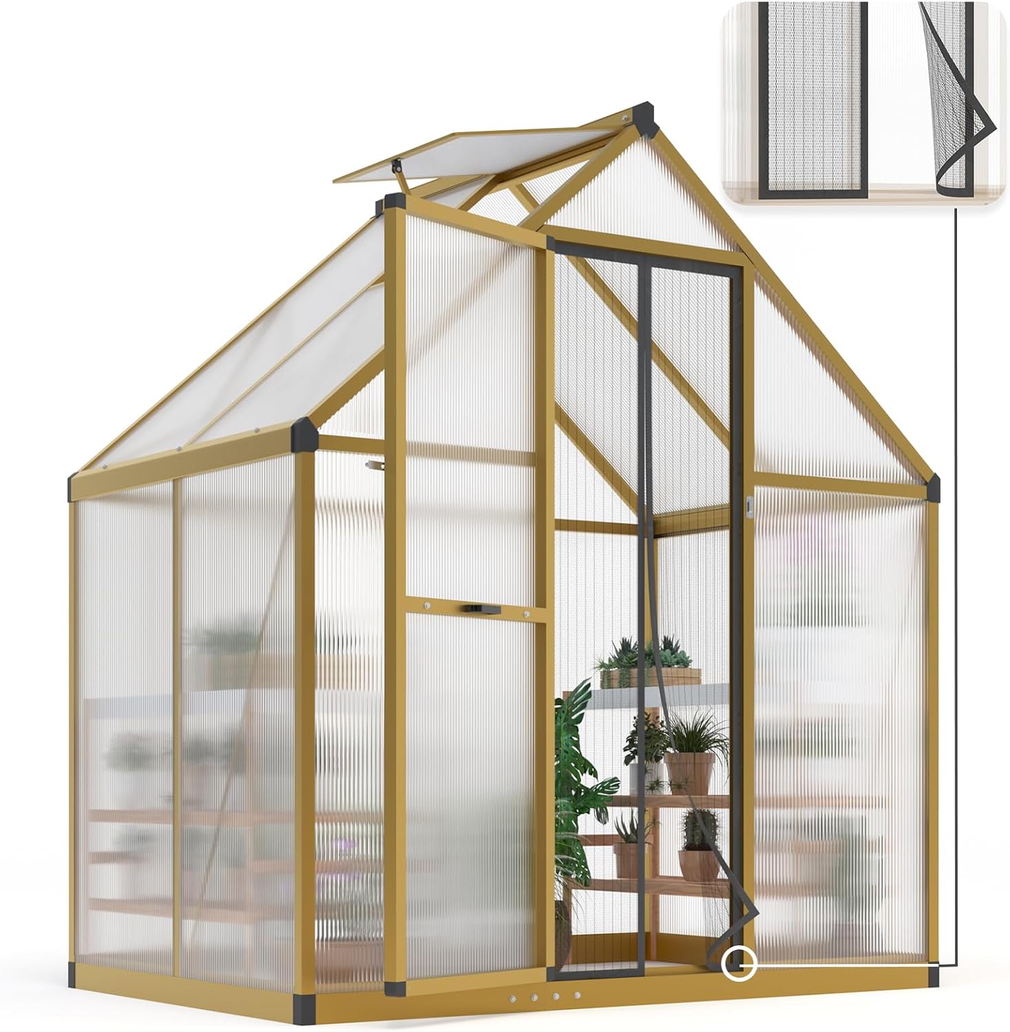 KING BIRD Greenhouse for Outdoors, 4x6 FT Polycarbonate Walk-in Green House, Quick-Setup Aluminum Frame UV Resistant Panel for Outside Garden Backyard W/ Lockable Screen Door, Vent, Wood-Like