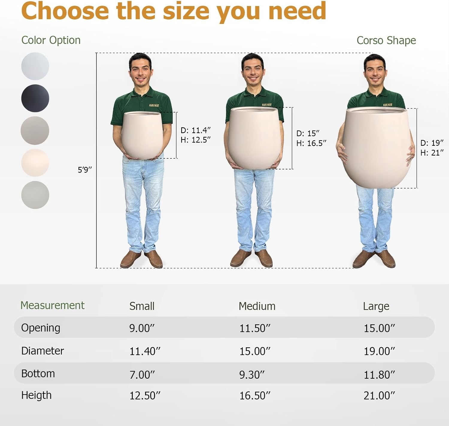 • Small Planter: 11.4"D x 12.5"H (9" Pot Opening)