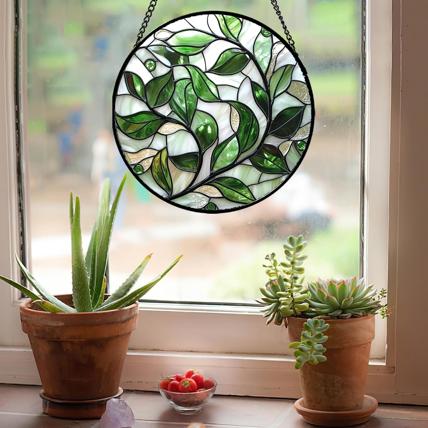Stained Glass Window Hanging - White Green Leaves Suncatcher for Doors Window Home Plant Sun Catchers Decor Christmas Mother's Day Birthday Gifts for Teacher Women Men Mom Nana 15 in