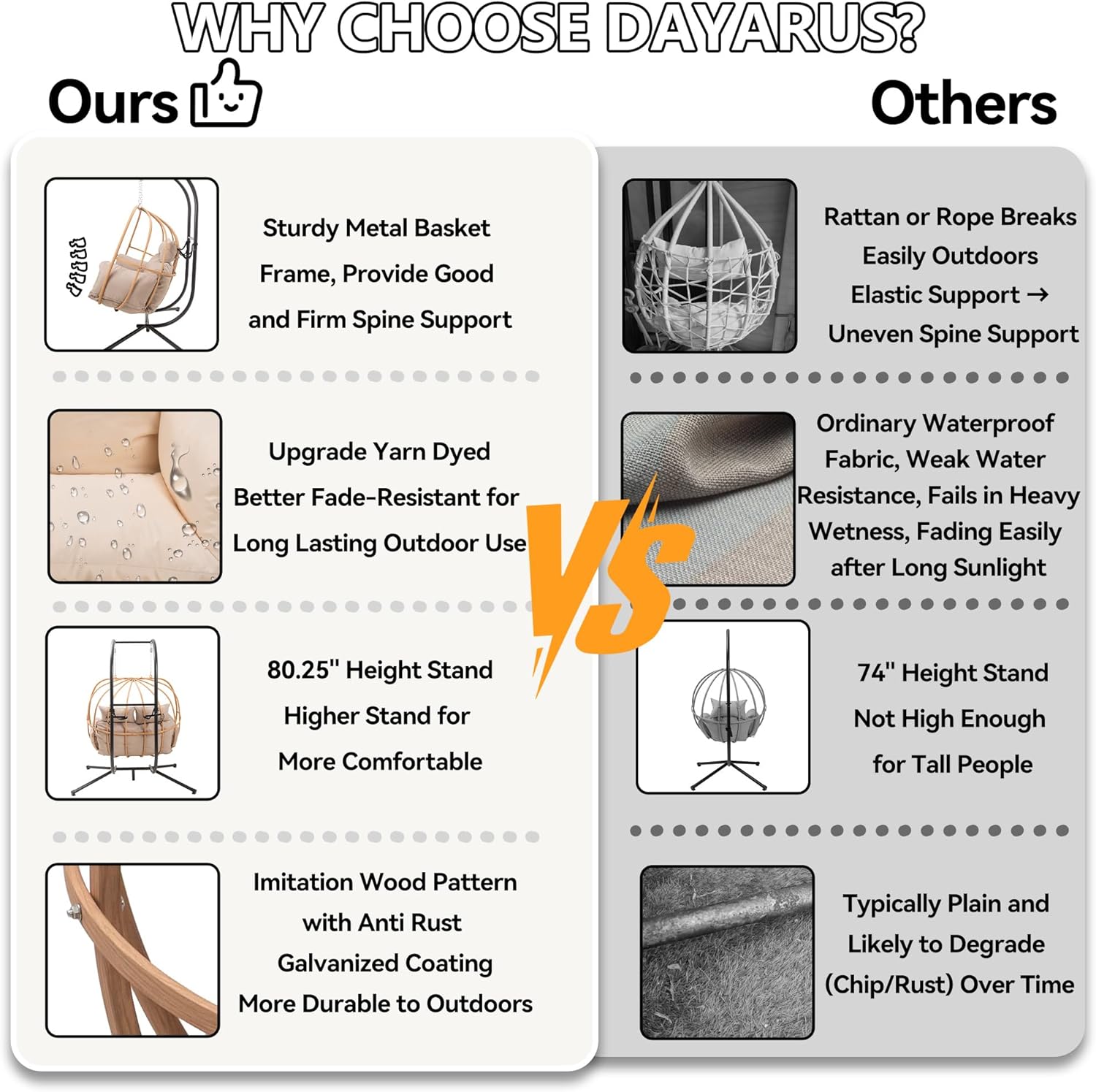 • Upgraded Quality: The outdoor egg chair has a fluffy cushion for soft sitting. its upgraded waterproof fabric resists sun, won't fade, suits all - weather use, and cleans easily, ensuring lasting outdoor use