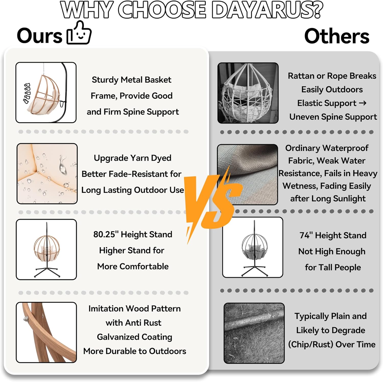 • Easy Care: The swing egg chair features a rust-resistant galvanized metal frame with a smooth, wood-grain finish that repels dust and stains. Simply wipe with a damp cloth to maintain its pristine