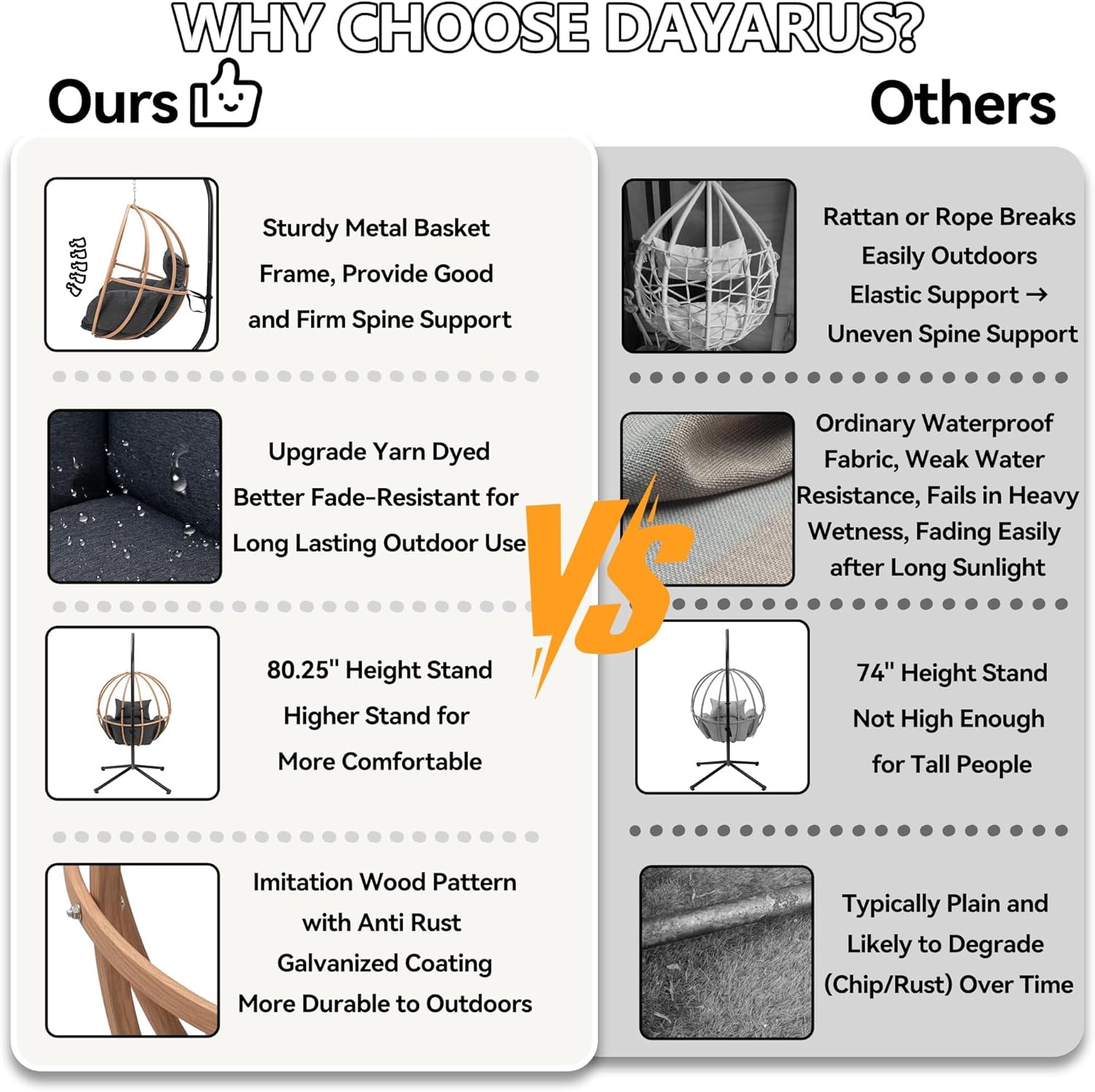 • Ultimate Comfort: This hanging egg swing chair features with a plush cushion and headrest, crafted from water and fade resistant yarn-dyed fabric, ensuring effortless relaxation in any weather