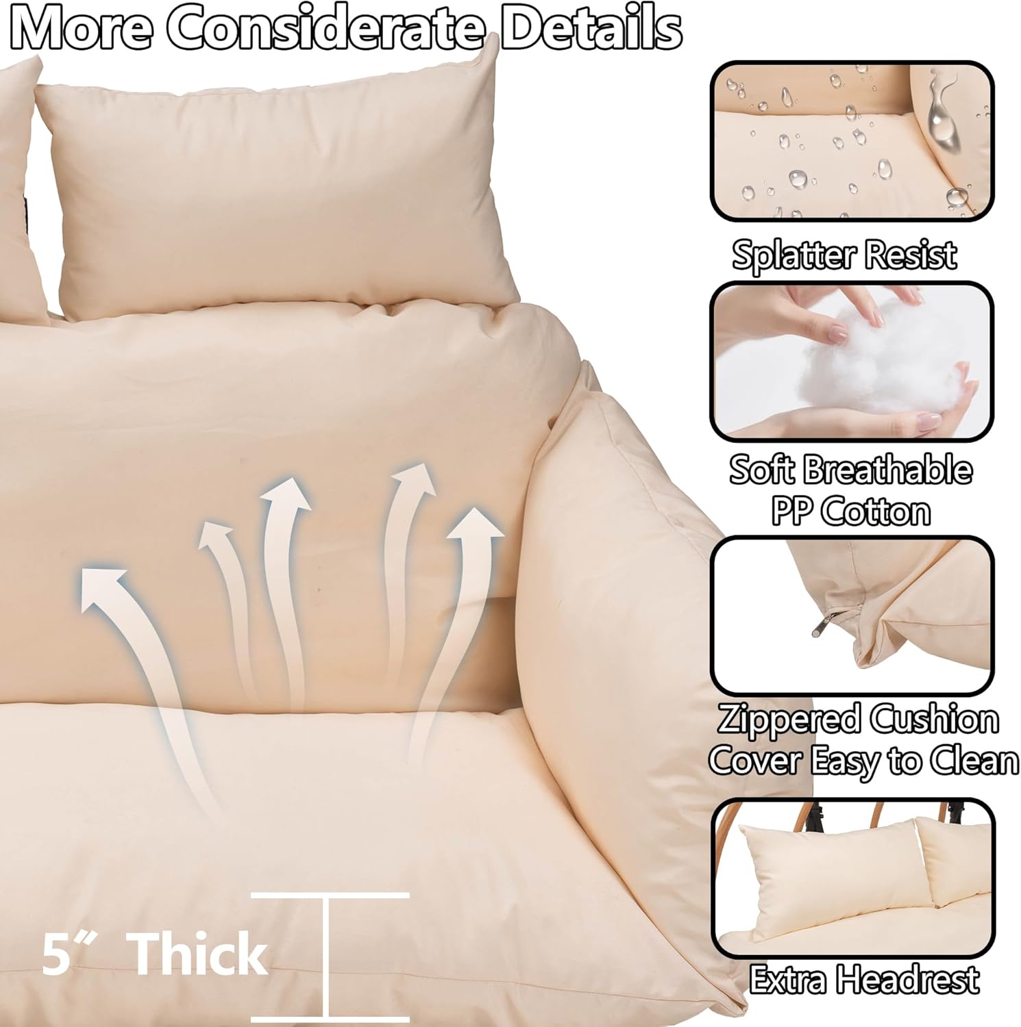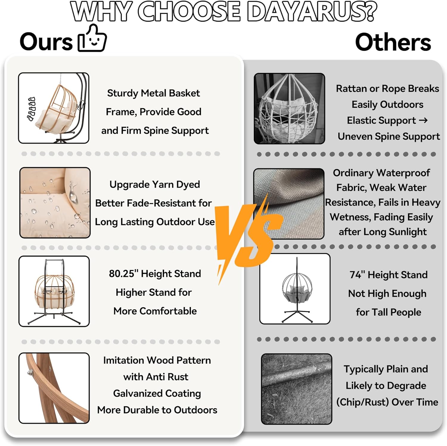 • Upgraded Quality: The outdoor egg chair has a fluffy cushion for soft sitting. its upgraded waterproof fabric resists sun, won't fade, suits all - weather use, and cleans easily, ensuring lasting outdoor use