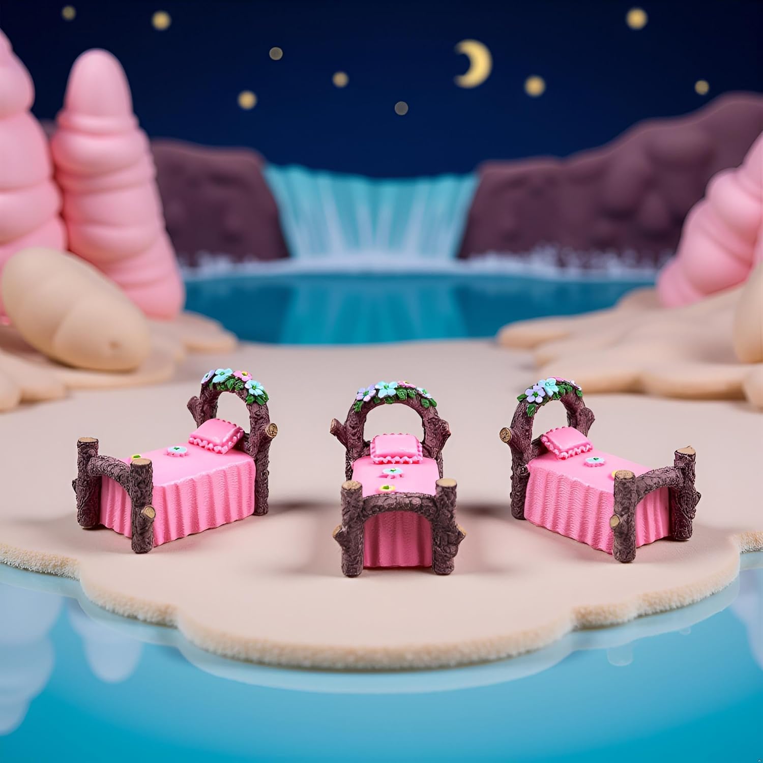 • MINIATURE DESIGN: Charming fairy garden bed figurine featuring a pink mattress with delicate floral details and rustic brown posts, perfect for magical garden displays