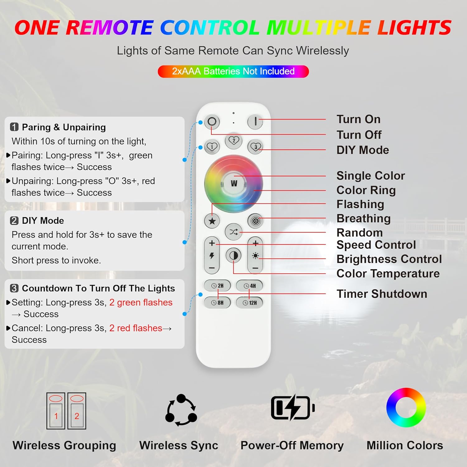 • WIRELESS-SYNC & CUSTOM CONTROL LIGHT: One remote for multiple lights. With power-off memory, DIY million colors; 100 ft signal (extendable) - each light can receive and transmit signals within 100 ft, and will automatically synchronize with other lights. This means you only need to power up, and each light can increase your control distance by 100 ft.