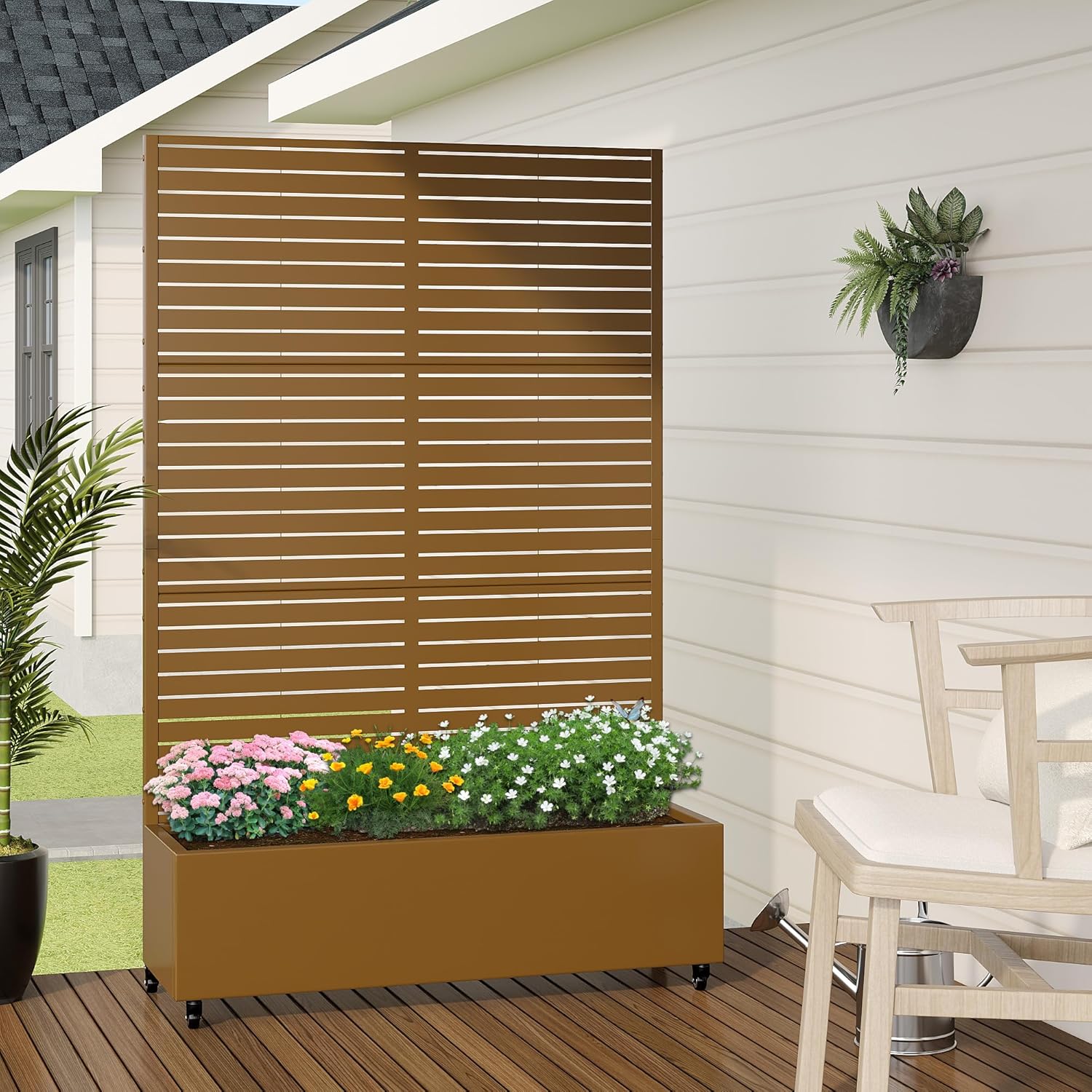 Casaphoria Metal Raised Garden Bed with Trellis and Wheels, 72"x47"x16" Planter Box for Climbing Plants, Vegetables & Vines, Features Drainage Holes and Privacy Screen (Brown-Louvered)