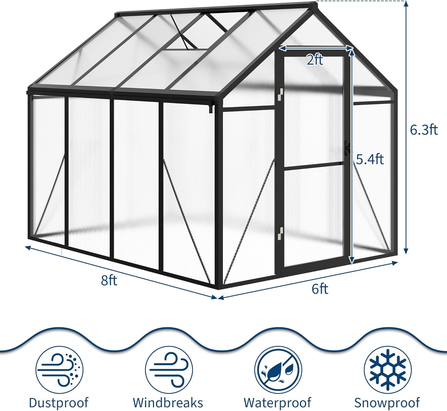 6x8 FT Greenhouse, Easy Assembly Aluminum Polycarbonate Greenhouses for Outdoors with Roof Vent and Ground Nails, Heavy Duty Aluminum Walk-in Greenhouse for Backyard, Sliding Lockable Door, Black