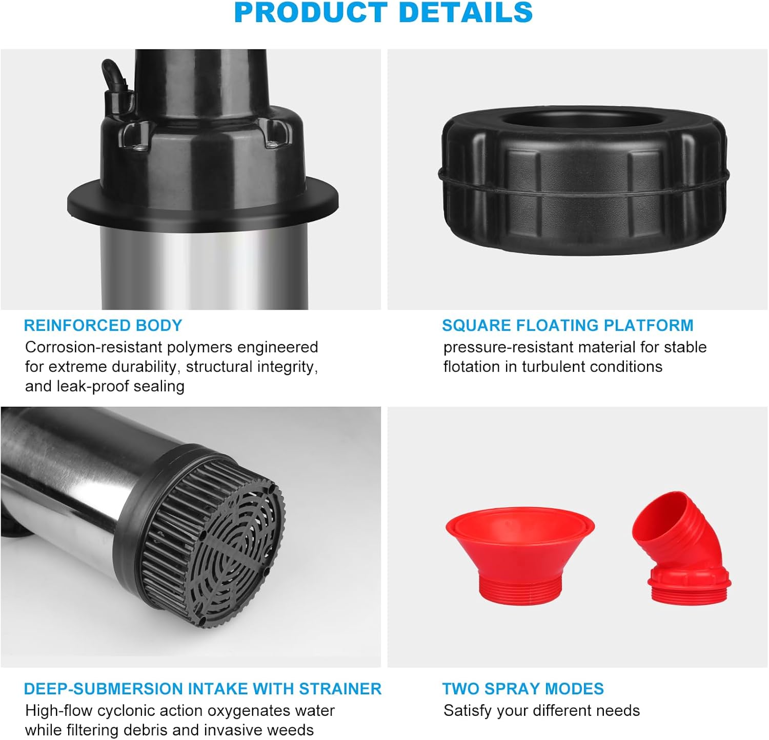• 【Sturdy & Efficient Construction】Designed for large ponds, our pond fountain aerator features a stainless steel housing and a corrosion-resistant all-copper motor. The thicker cable enhances safety and power transmission, while the filtered intake prevents debris and weeds, ensuring smooth water flow and pump protection.