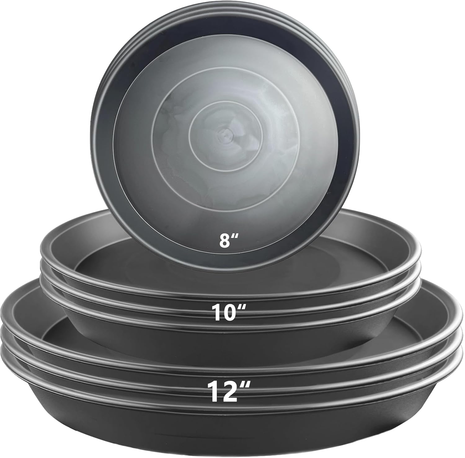 • 【Multi-Size Set for Versatile Use】 Includes 9 plant saucers: 3 × 8" (20.5 cm OD / 17 cm ID / 2.7 cm H / each 100 g), 3 × 10" (25.5 cm OD / 21.5 cm ID / 3 cm H / each 135 g), and 3 × 12" (29.5 cm OD / 25.5 cm ID / 3.2 cm H / each 163 g). Perfect for different flower pots and gardening needs.