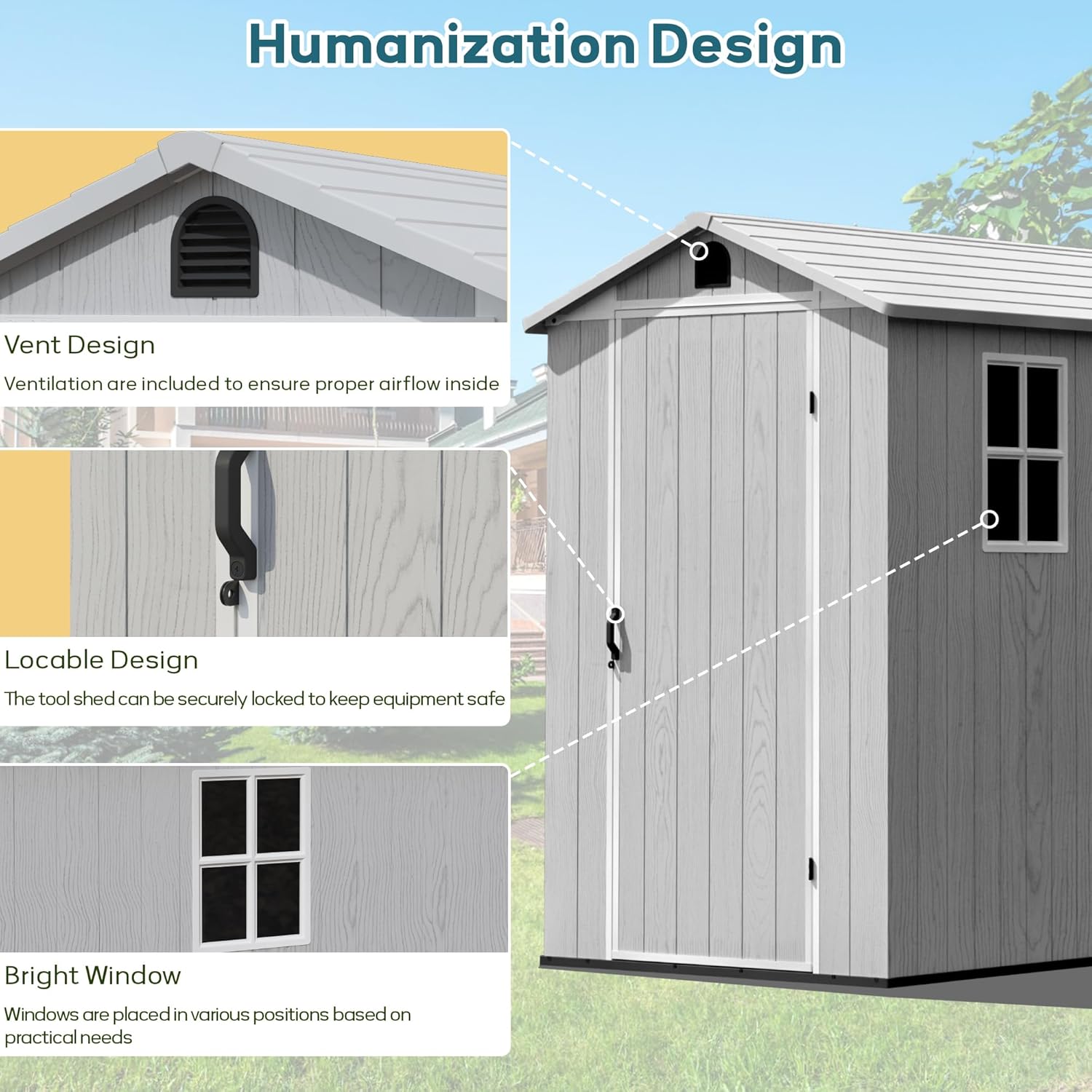 Greesum 4×6FT Plastic Outdoor Storage Shed with Floor, Resin Storaged Sheds with Lockable Door, Window & Vent, All-Weather Tool Sheds for Garden, Backyard, Patio, Light Gray (One-Piece Panel)