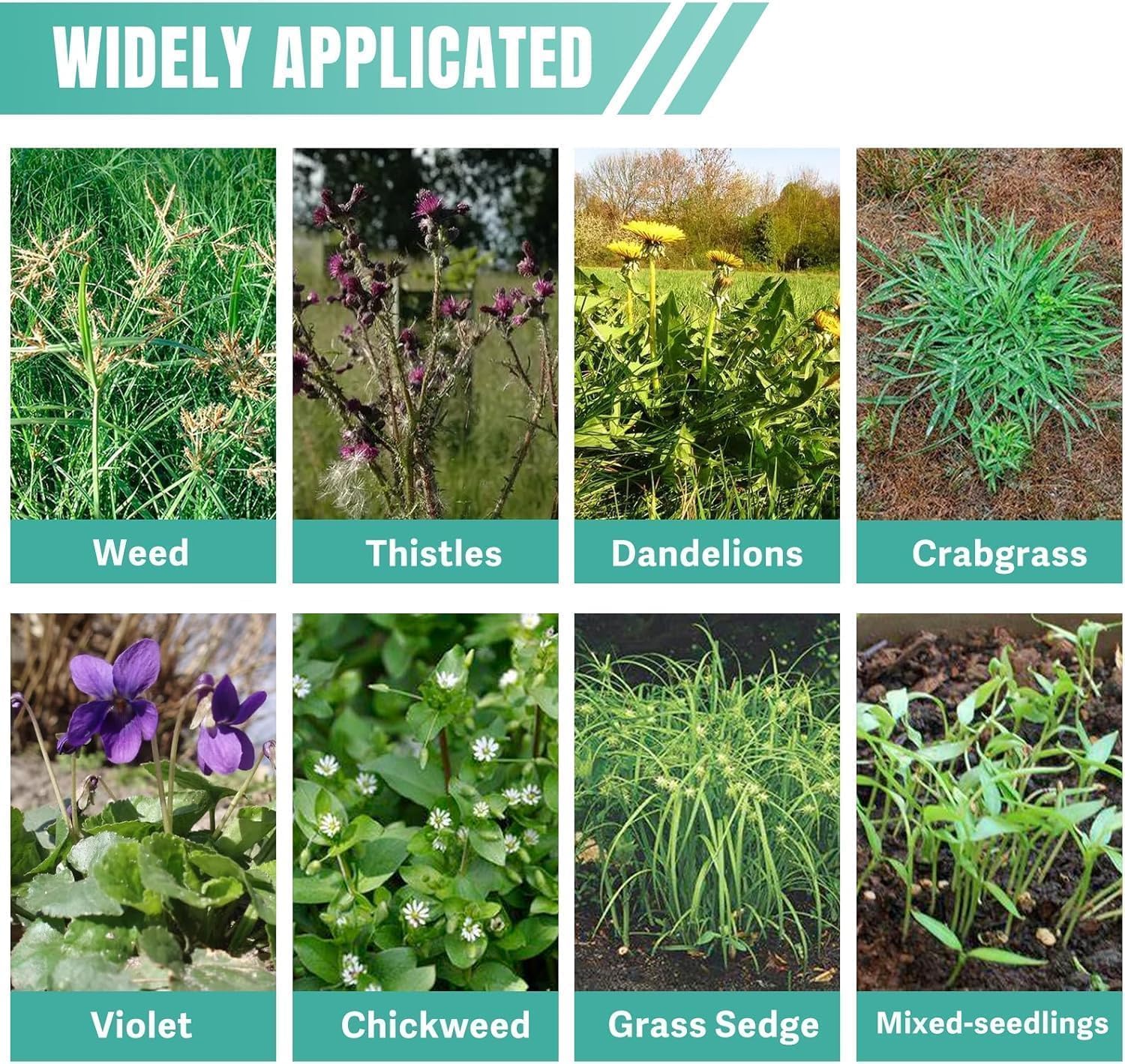 • 【Sturdy & Durable Weed Puller】This heavy-duty weed puller features a thick and a long design for durability. It includes a nylon foot pedal and four non-bending manganese steel claws with serrated edges, ensuring long-term use. It effectively removes weeds like crabgrass, dandelions, thistle, clover, ryegrass, and chicory.