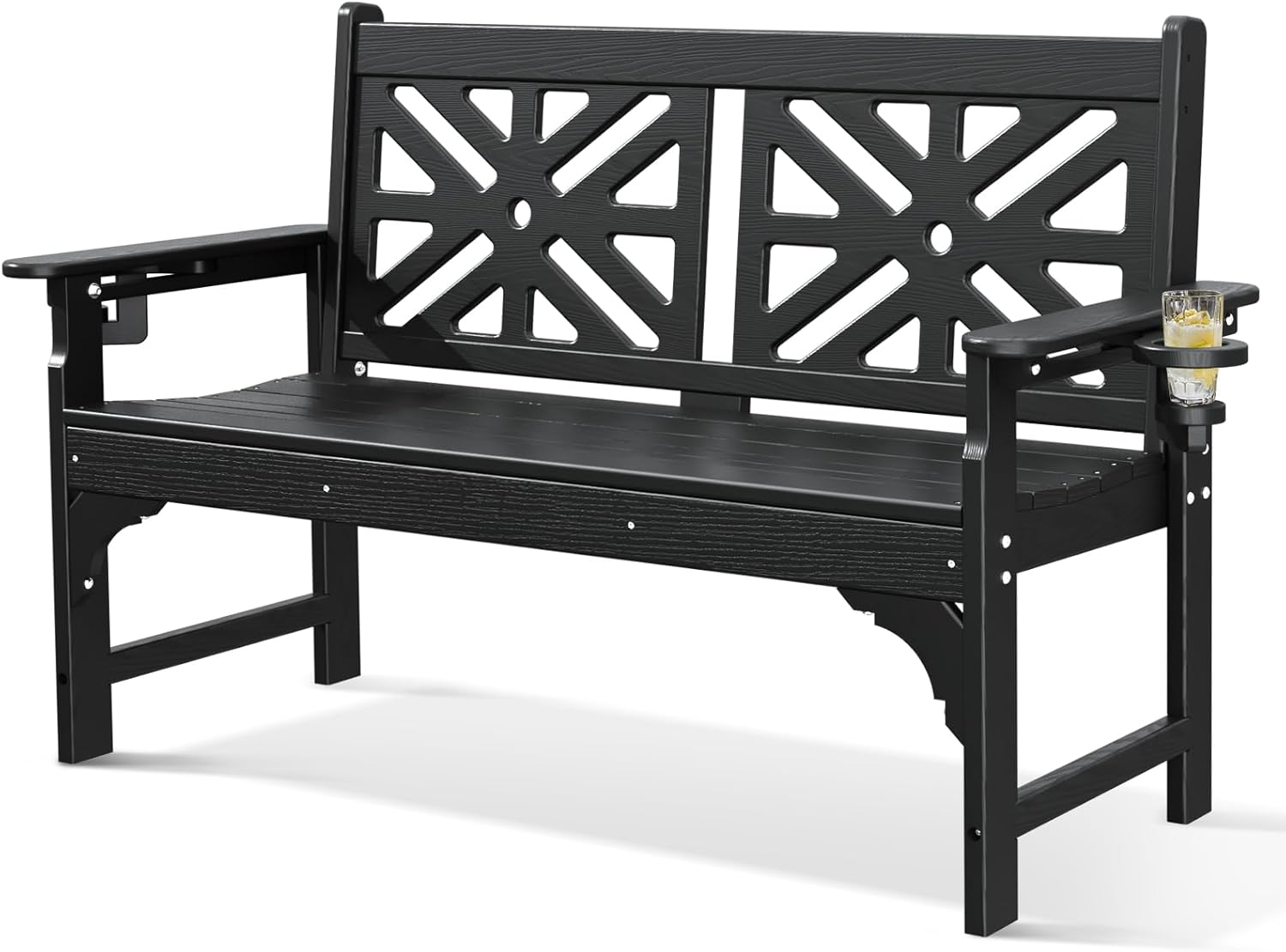 Oversized Outdoor Bench with Cup Holders, 51.5” HDPE Aesthetic Garden Bench for 2 Person, Memorial Benches - Easy Assembly & All Weather, for Porch & Patio, 800lbs Load Capacity (Black, 1pc)