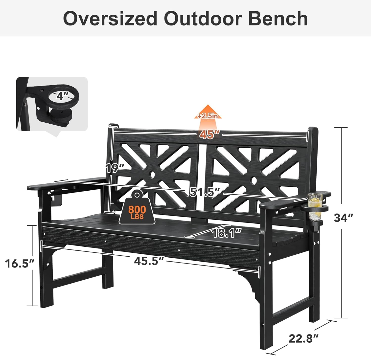 • 【Oversized Outdoor Bench】The dimension of this garden bench is 51.5’L x 22.8’W x 34’H. The widened seat and back are spacious enough to provide sufficient support for 2 people at the same time. Besides, the convenient armrests and cup holders on both sides care for your arms and drinks.